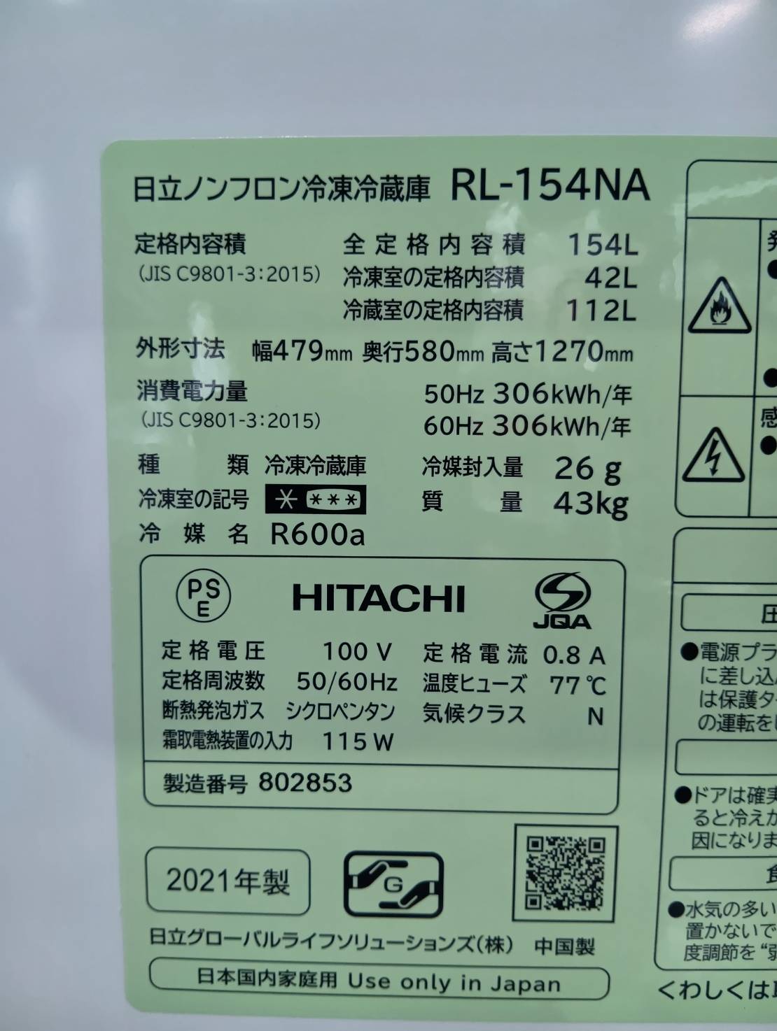 HITACHI2021年製154L冷蔵庫 RL-154NA