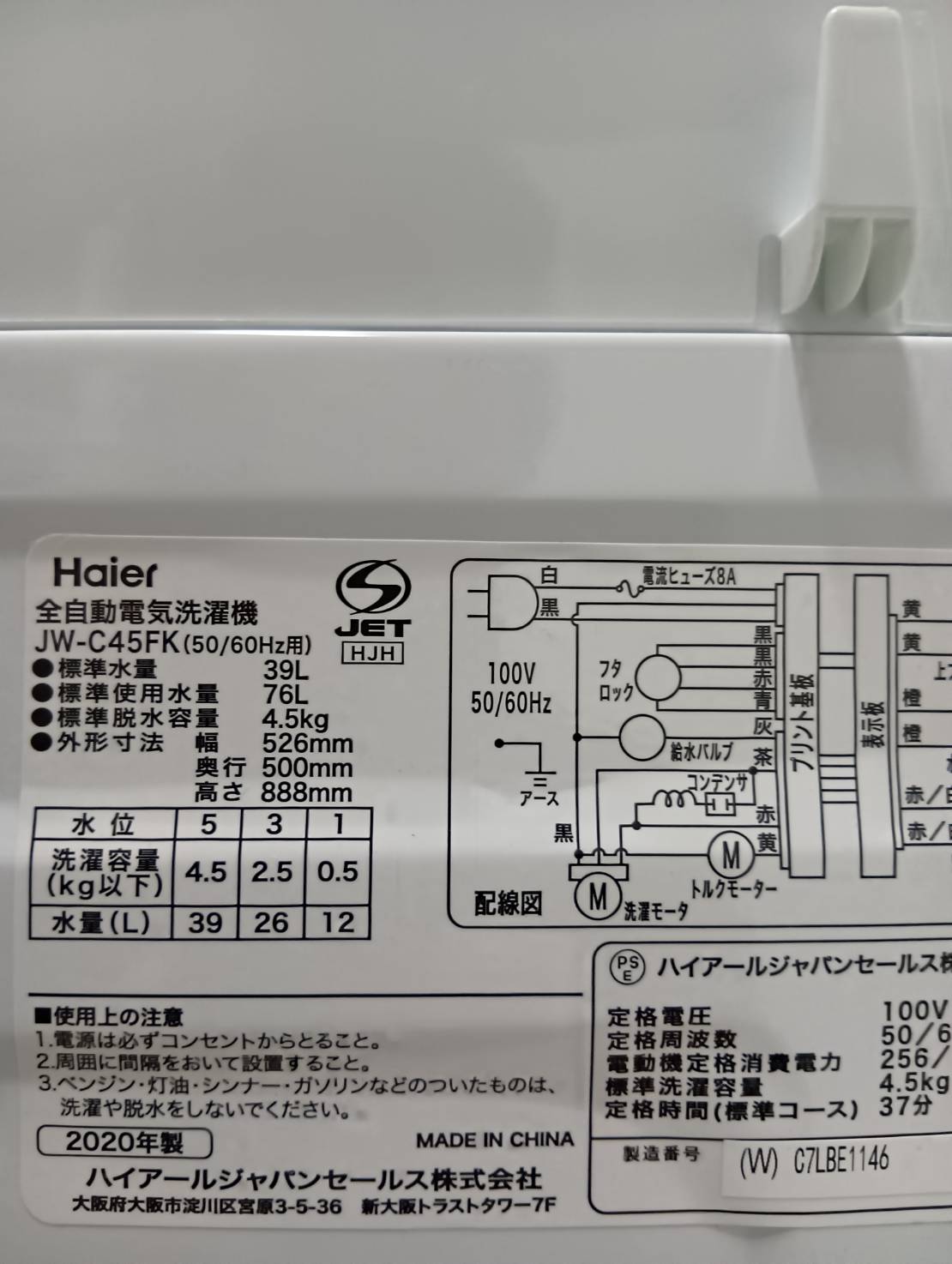 Haier2020年製4.5Kg洗濯機 JW-C45FK