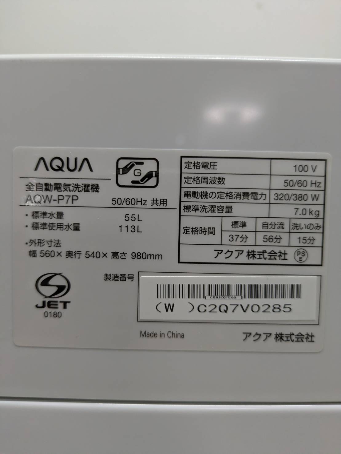 AQUA2024年製7.0Kg洗濯機 AQW-P7P