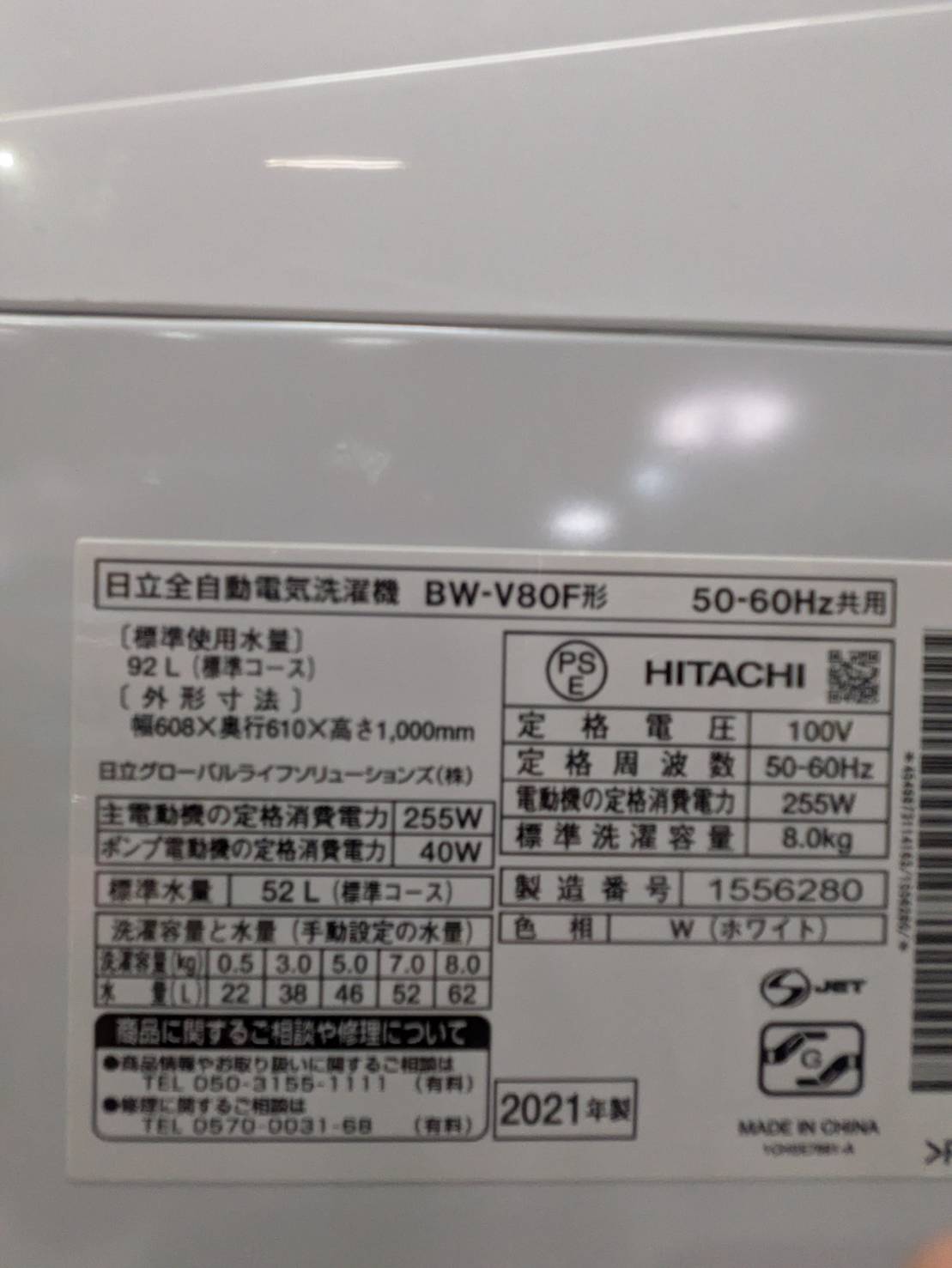 HITACHI2021年製8.0Kg洗濯機 BW-V80F