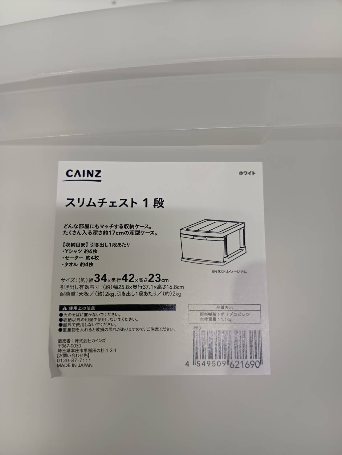 CAINZ スリムチェスト1段 型番: 幅*奥行*高さ 幅34×奥行42×高さ23cm 評価ランク A 【コンデションなど】 目立つダメージはございません。 【製品特徴】 スリムなチェスト1段です。押し入れ収納などにご使用ください。