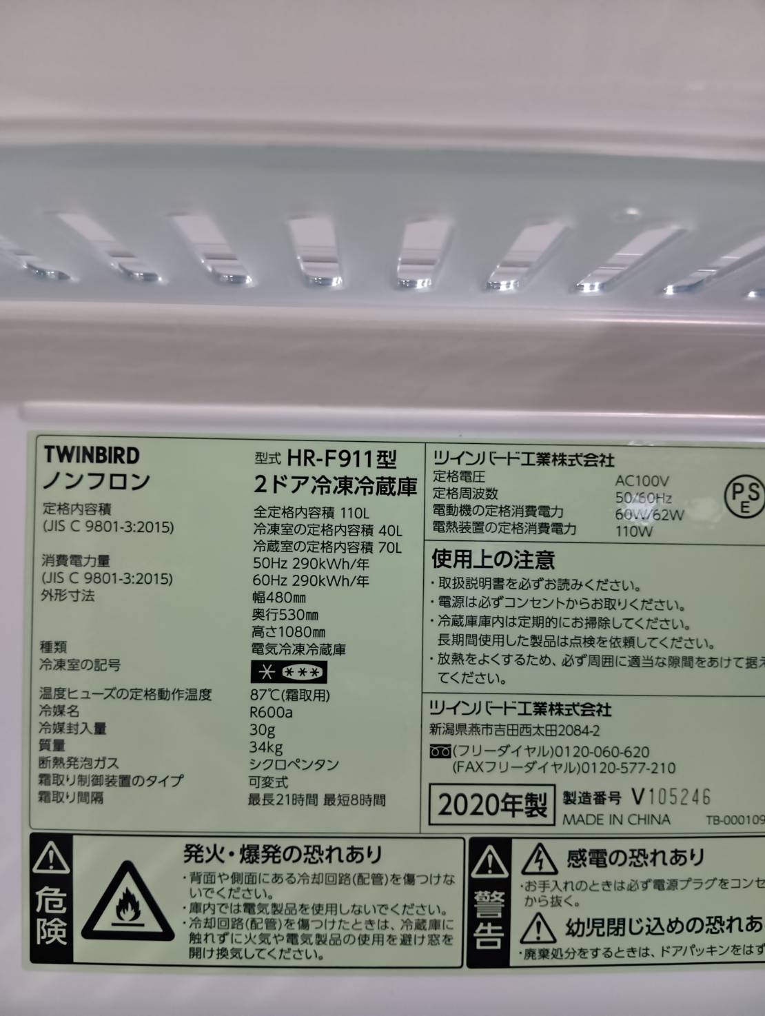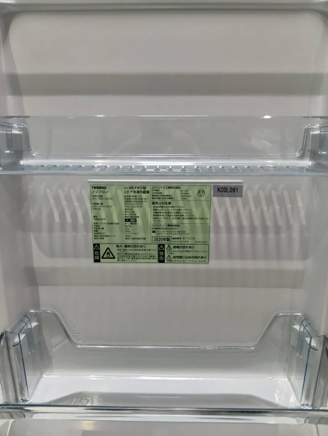 TWINBIRD2020年製110L冷蔵庫 HR-F911