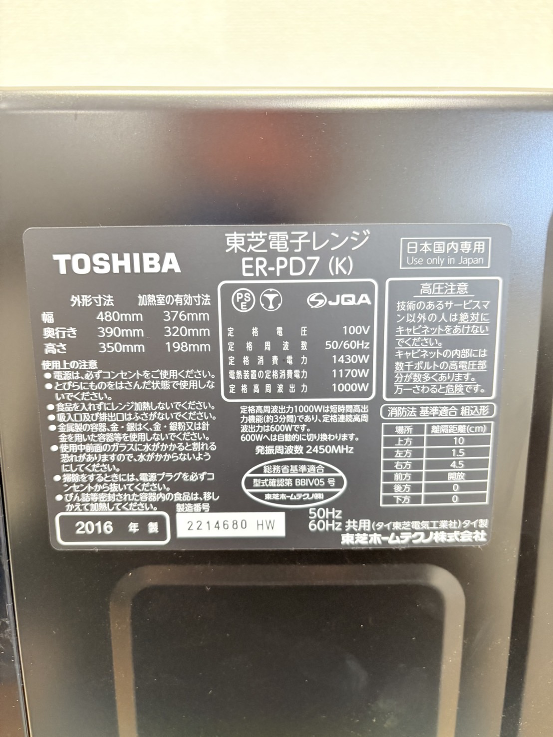 TOSHIBA2016年製オーブンレンジ ER-PD7