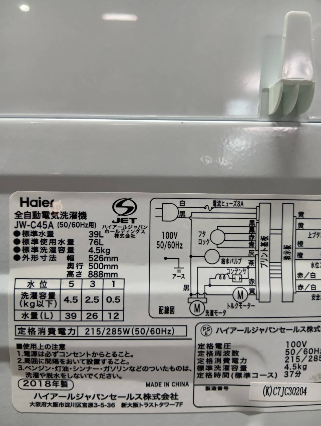 Haier2018年製4.5Kg洗濯機 JW-C45A