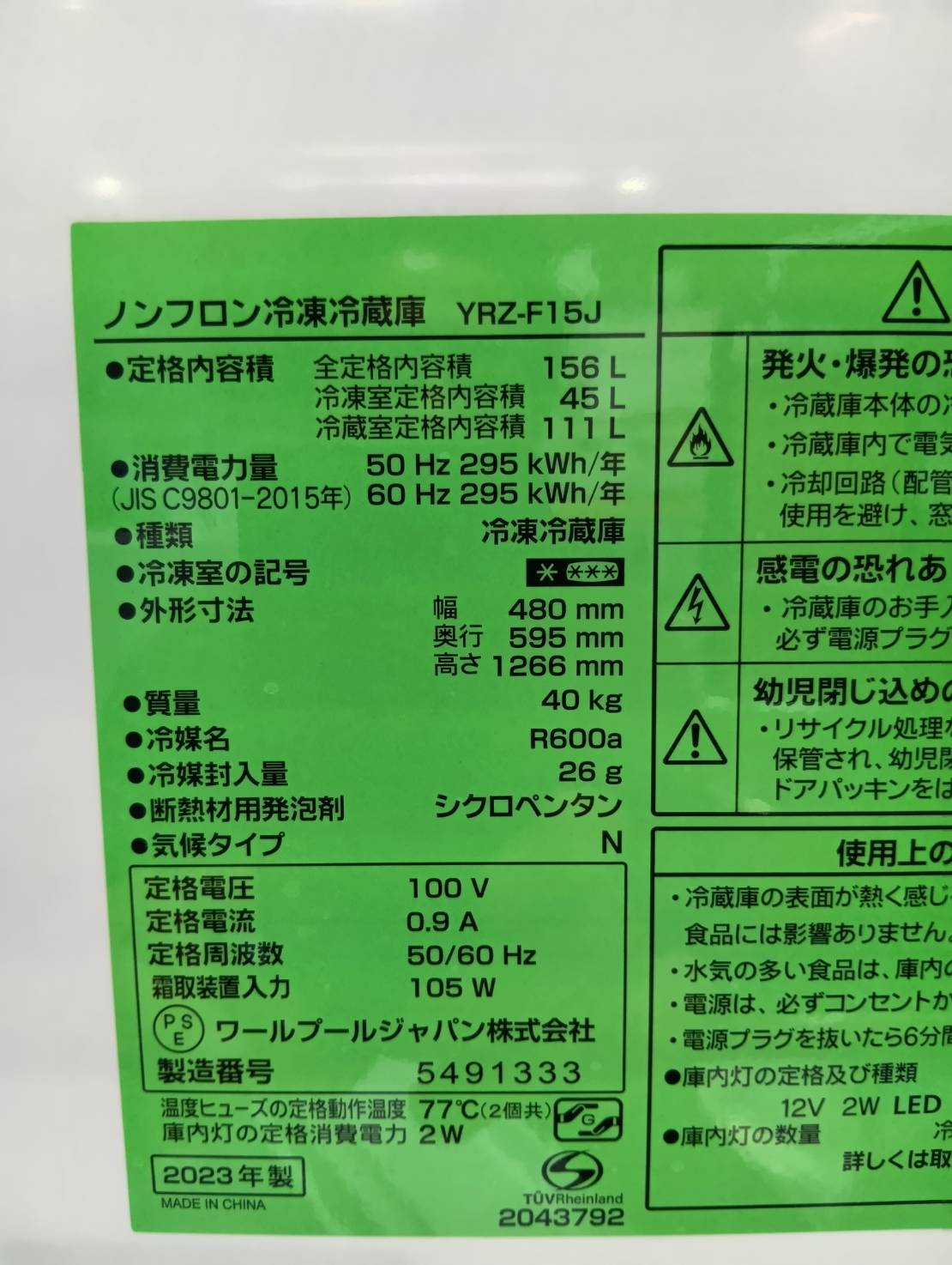 YAMADA2023年製156L冷蔵庫 YRZ-F15J