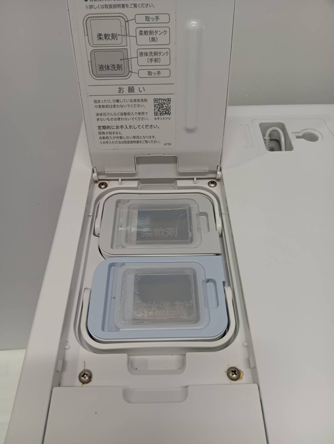 「液体洗剤・柔軟剤自動投入」を搭載したドラム式洗濯乾燥機。洗濯物の量に合わせて液体洗剤や柔軟剤を必要量投入し、補充時期もスマホで知らせる。