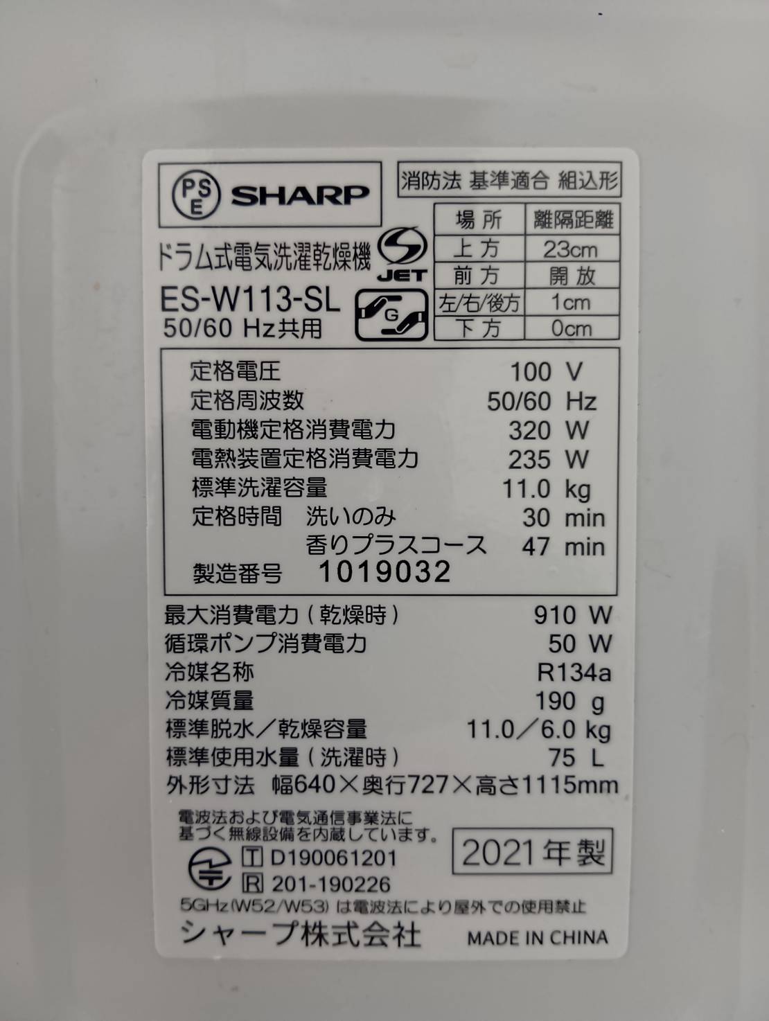 SHARP2021年製ドラム式洗濯乾燥機 ES-W113-SL