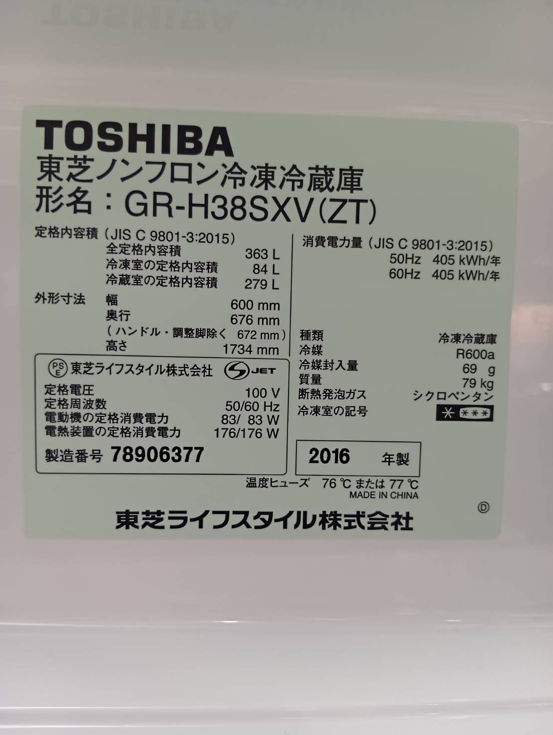 【訳有品】TOSHIBA2016年製363L冷蔵庫 GR-H38SXV