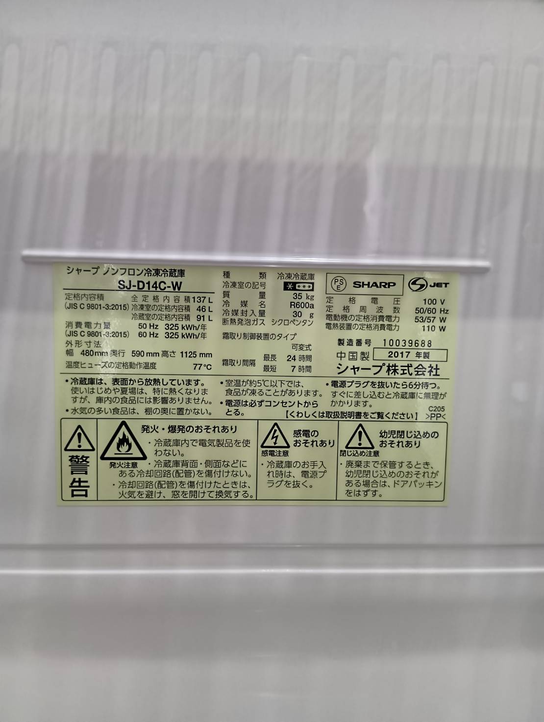 SHARP2017年製137L冷蔵庫 SJ-D14C-W