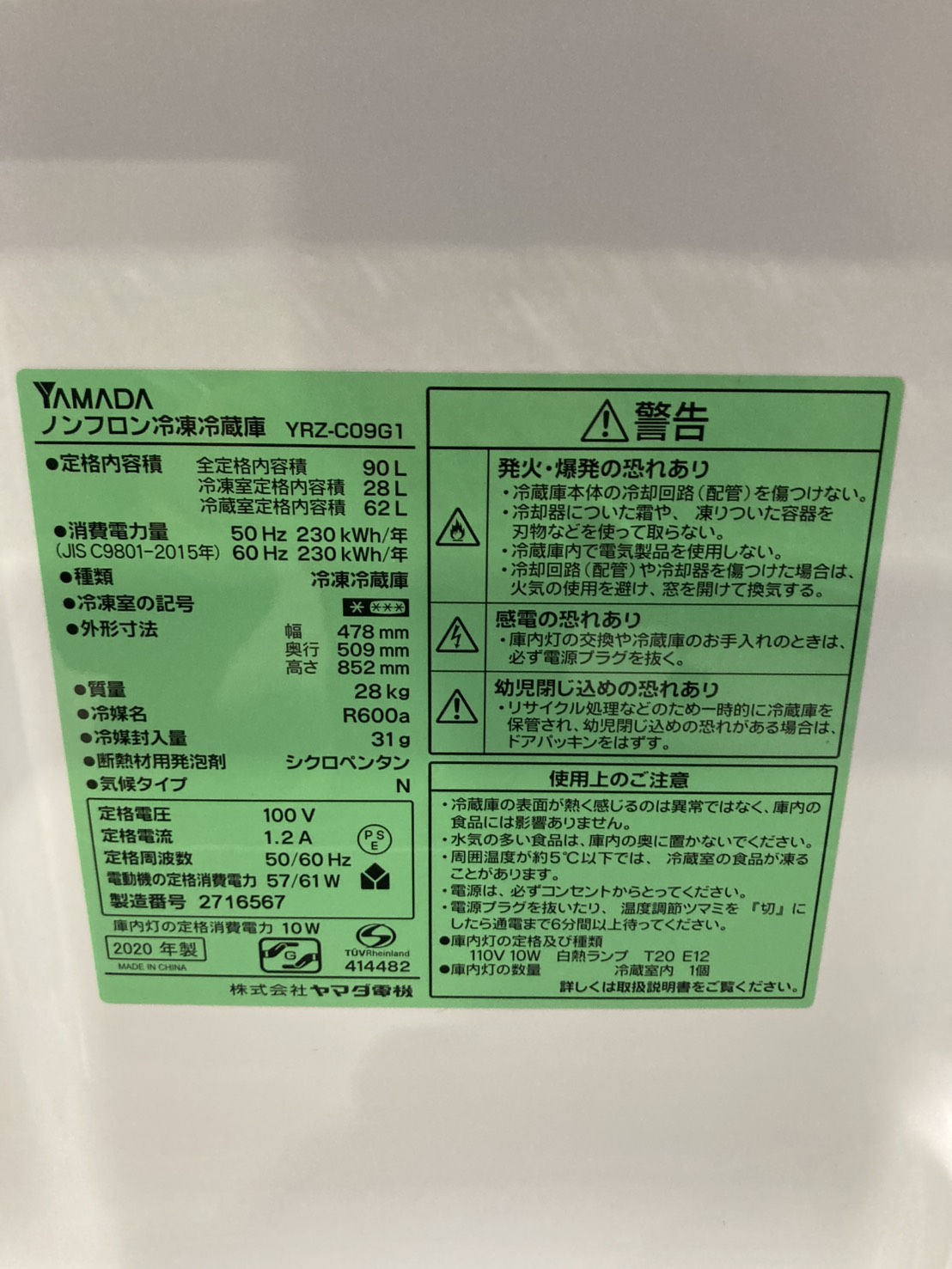 YAMAZEN2020年製90L冷蔵庫 YRZ-C09G1 型番 YRZ-C09G1 幅 奥行き 高さ 478*509*852㎜ 容量 冷凍室28L 冷蔵室62L 動作テスト 冷凍-28℃ 冷蔵2℃ 評価ランク B 【コンデションなど】 扉側面に小さな傷、その他パッキンが所々変色しております。その他全体的にキレイな状態です。 【製品特徴】 ●サブとして使える2ドア直冷式冷蔵庫 90L ●小さく置き場所に困らない。 【保証期間】 商品到着から6カ月
