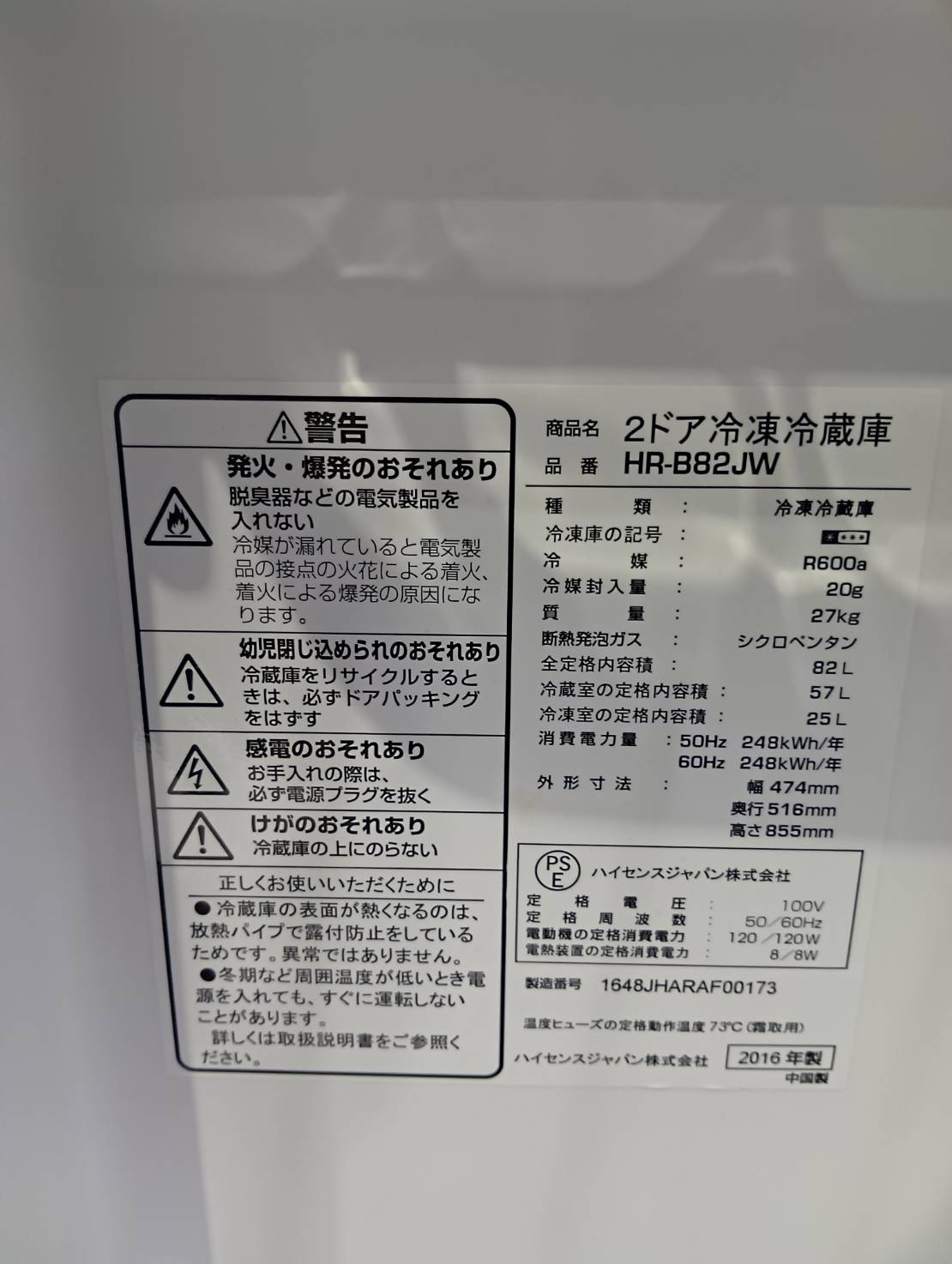 Hisense2016年製82L冷蔵庫 HR-B82JW 型番 HR-B82JW 幅 奥行き 高さ 474*516*855㎜ 容量 冷凍室25L 冷蔵室57L 動作テスト 冷凍-10℃ 冷蔵5℃ 評価ランク B 【コンデションなど】 所々に小さな凹み、や落とし切れない汚れがございます。 【製品特徴】 コンパクトサイズで、置き場所に困りません! 【保証期間】 商品到着から6カ月