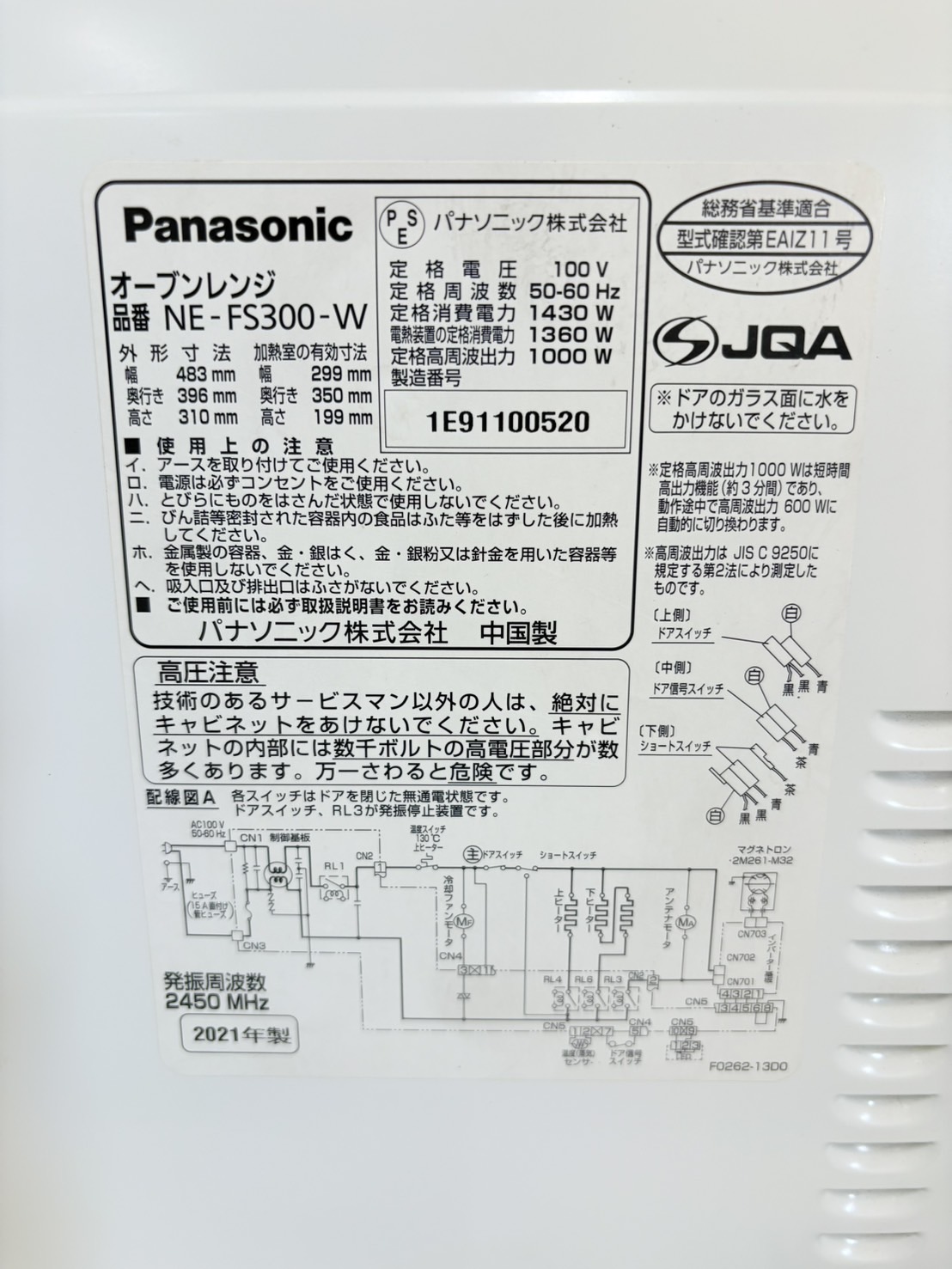 Panasonic2021年製オーブンレンジ 型番 NE-FS300-W 本体サイズ 幅*奥行*高さ 483*396*310㎜ 庫内サイズ 幅*奥行*高さ 299*350*199㎜ 動作確認 OK 評価ランク B 【コンディションなど】 細かいキズ汚れ、庫内に焦げダメージがあります。 【保証期間】 商品到着から2カ月