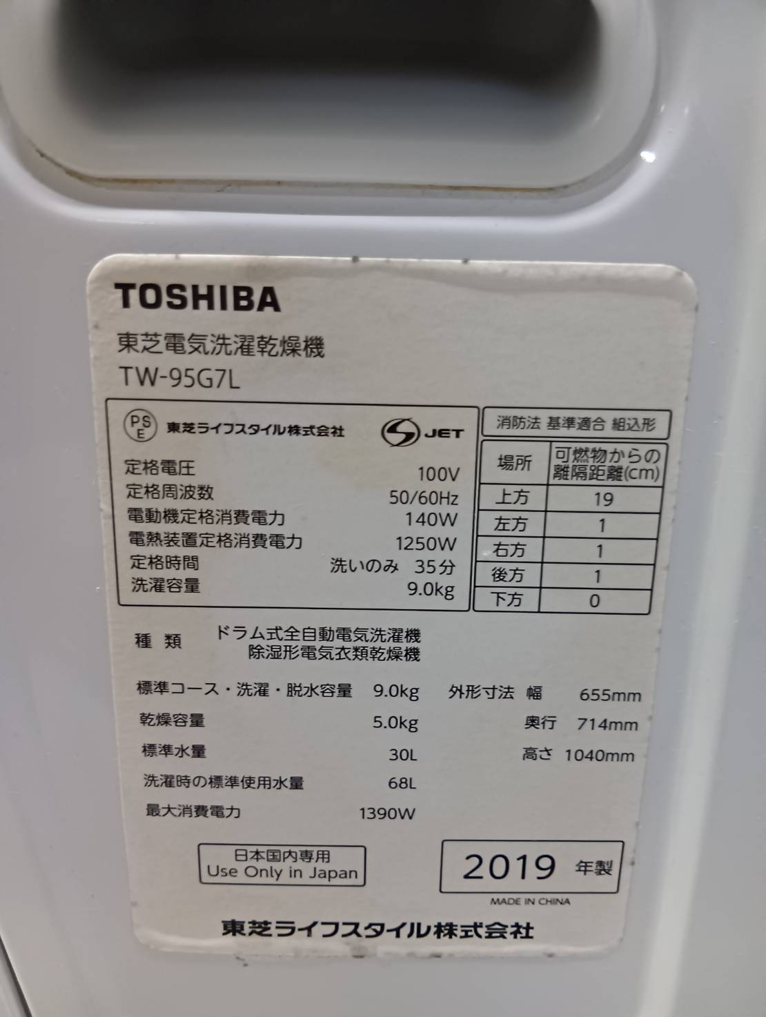 TOSHIBA2019年製ドラム式乾燥洗濯機 TW-95G7L