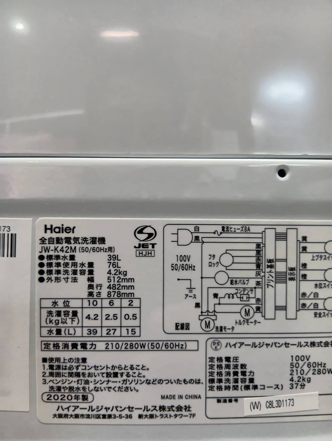 Haier2020年製4.2Kg洗濯機 JW-K42M