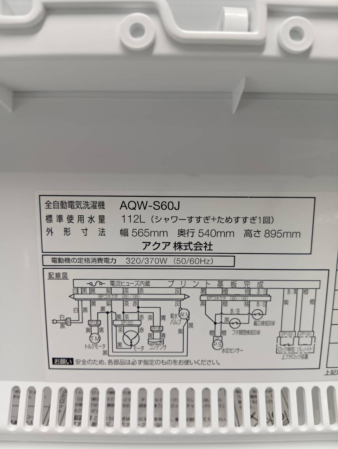 AQUA2021年製6.0Kg洗濯機 AQW-S60J