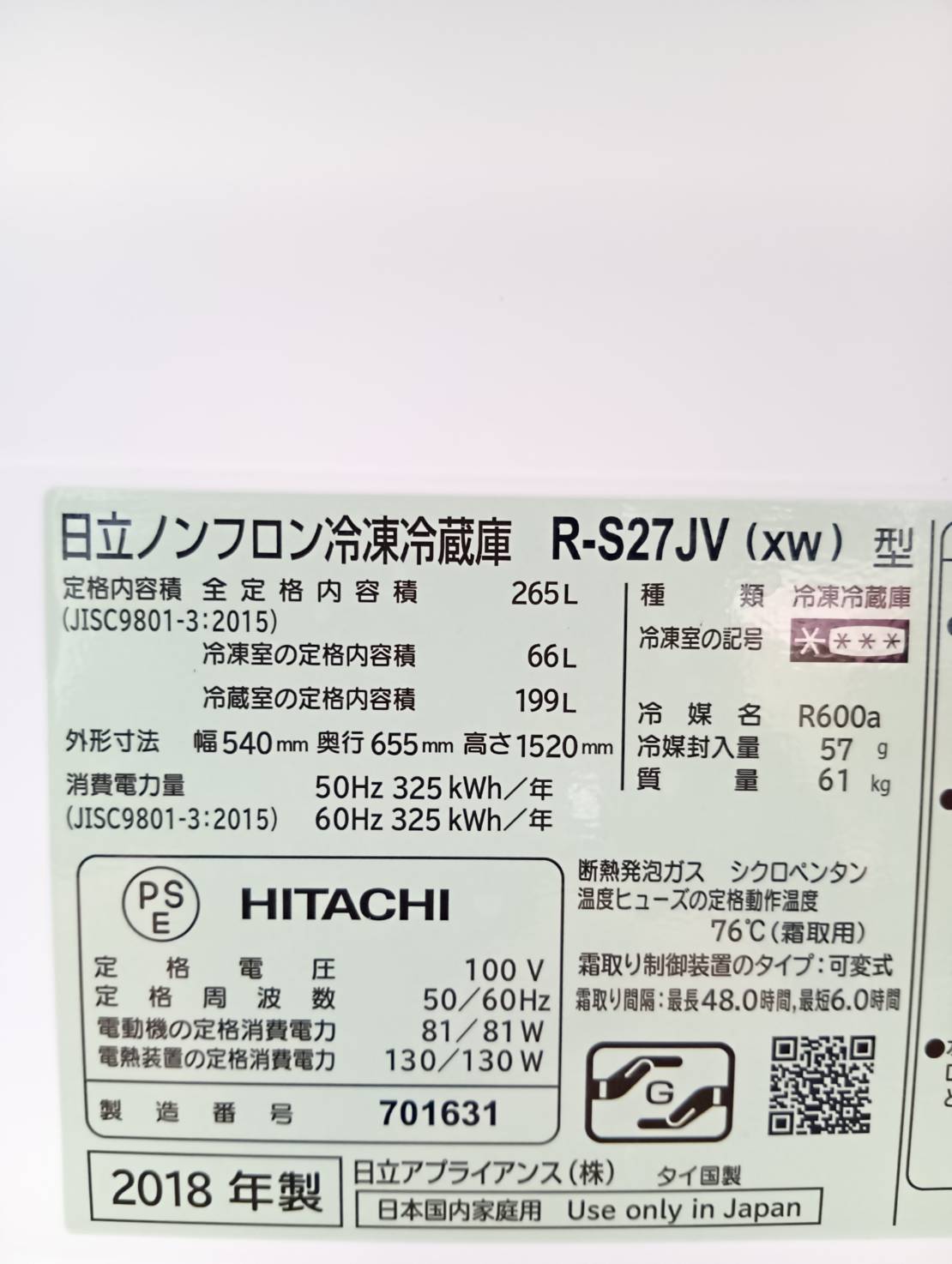 HITACHI2018年製265L冷蔵庫 R-S27JV
