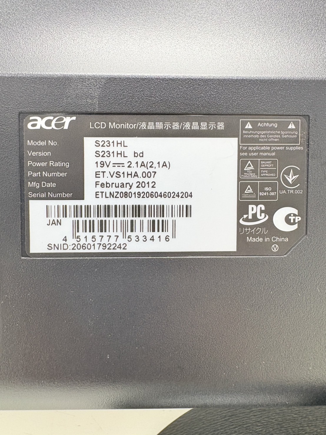 型番 S231HL