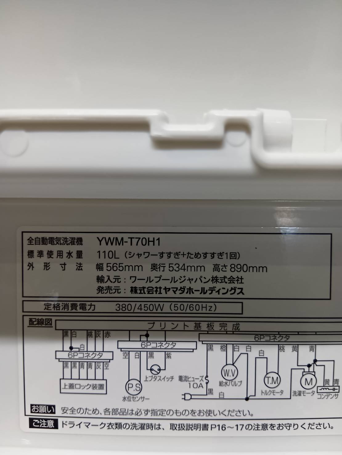 YAMADA2023年製7.0Kg洗濯機 YWM-T70H1