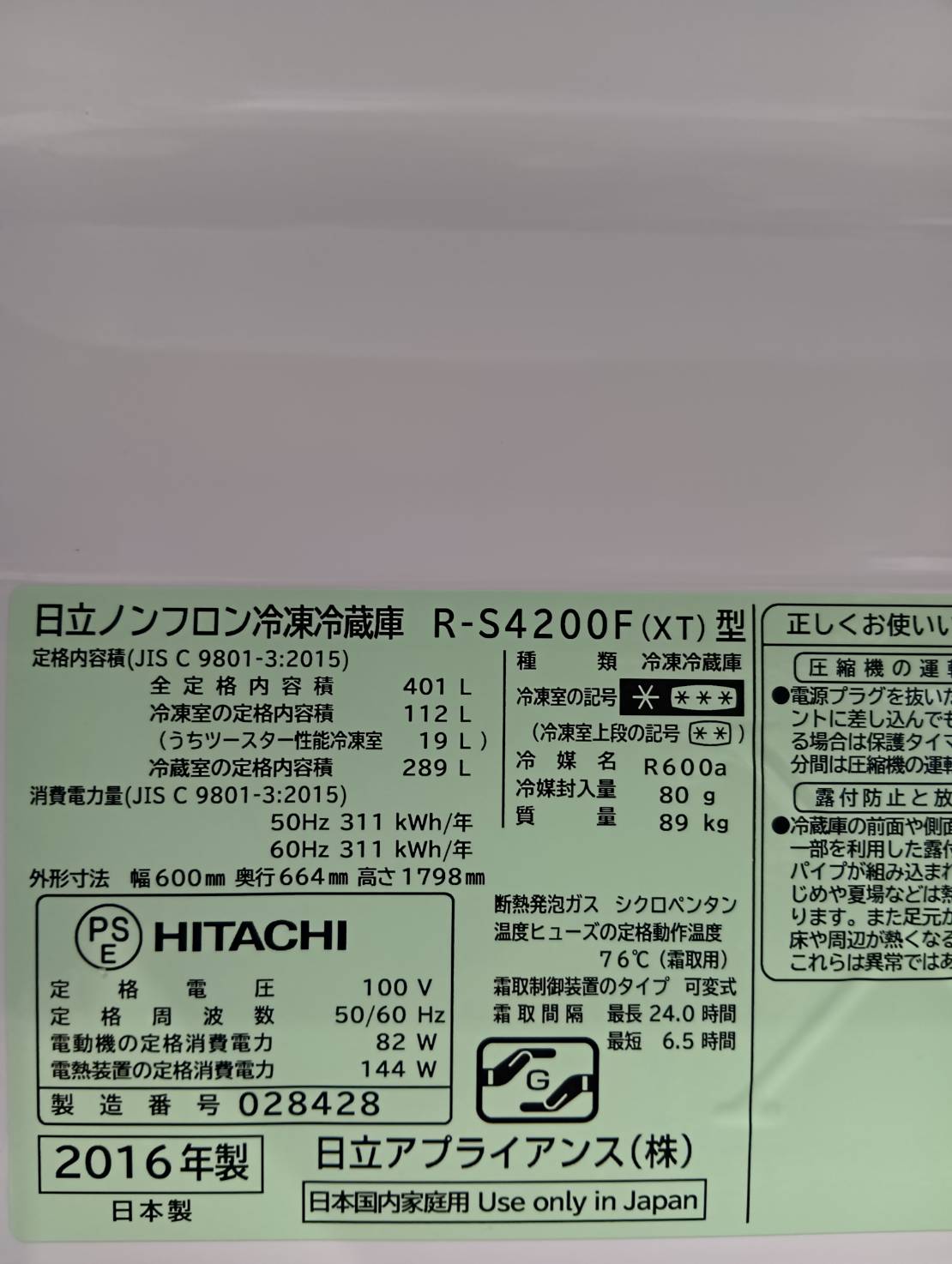 HITACHI2016年製401L冷蔵庫 R-S4200F