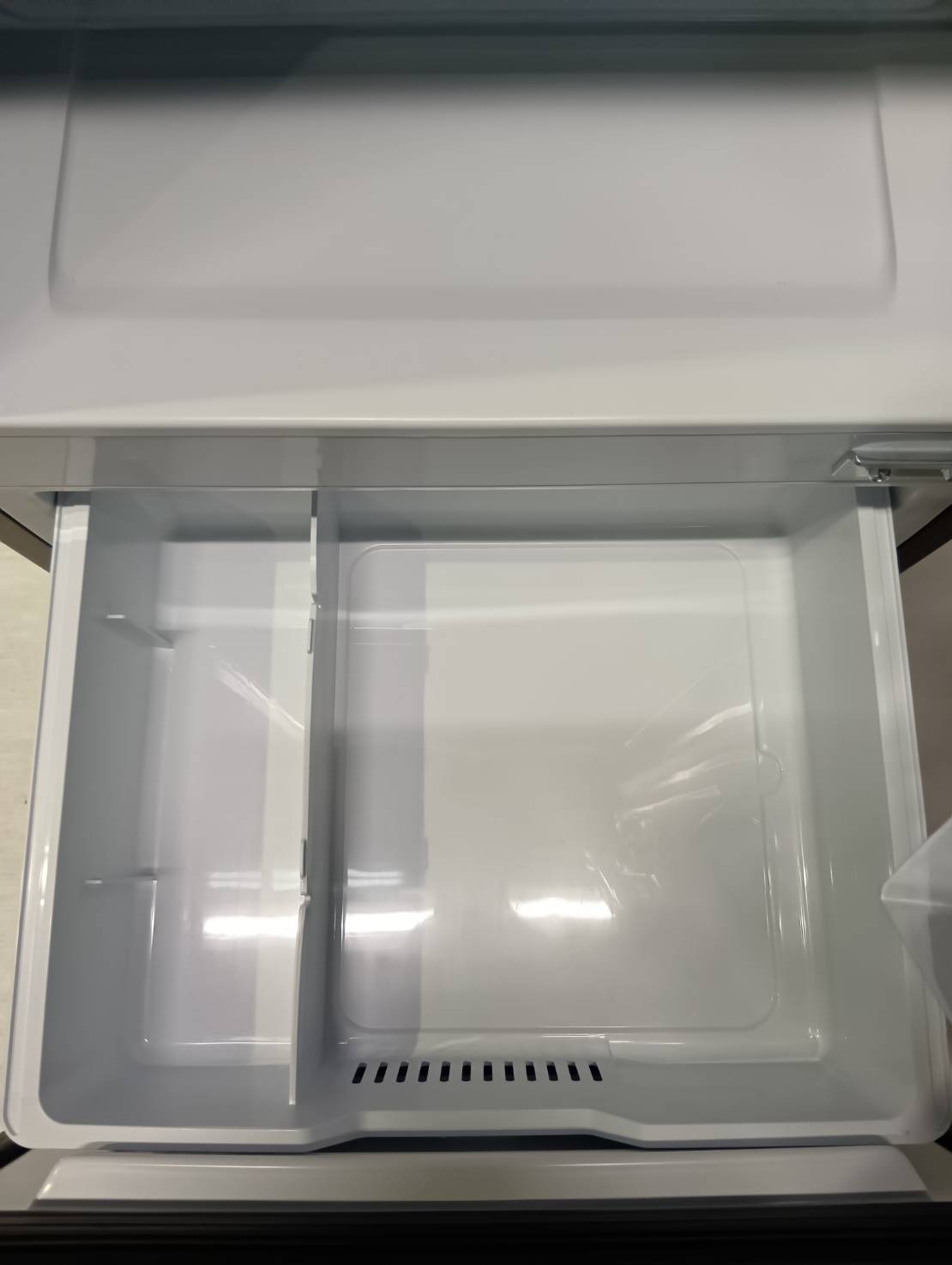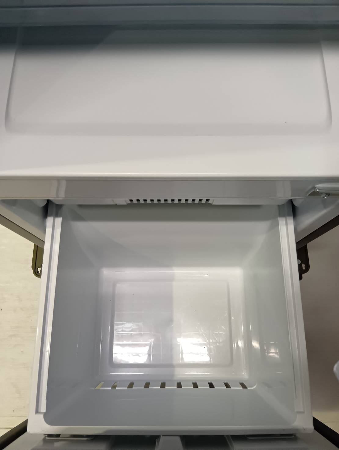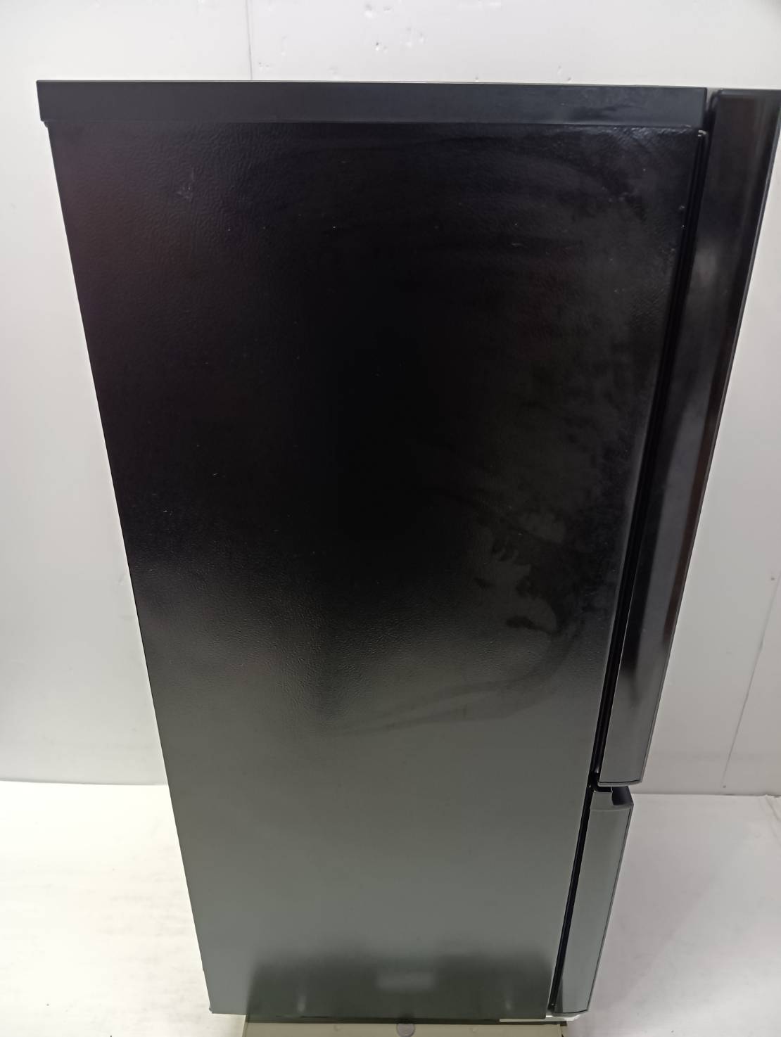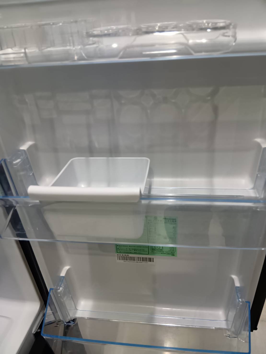 大容量ドアポケットを備えた冷凍冷蔵庫(162L)。2Lペットボトルを3本置いてもまだ余裕で、3段になってさらに便利になっている。スタイリッシュなデザインのガラストップで傷が入りにくい。