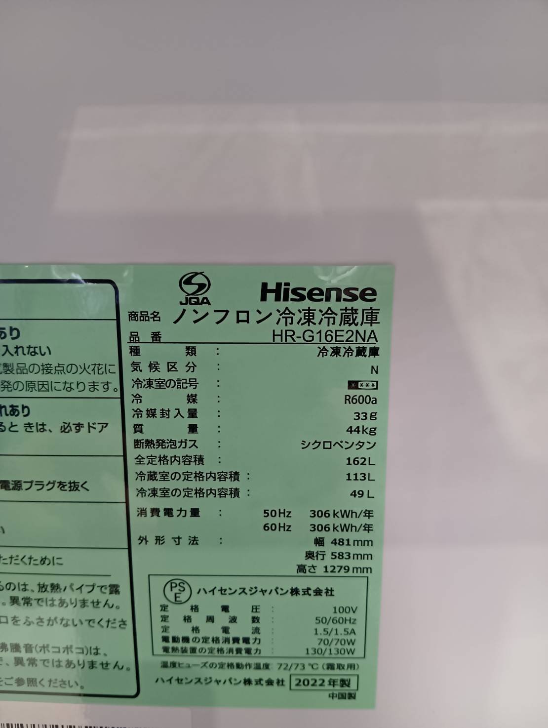Hisense2022年製162L冷蔵庫