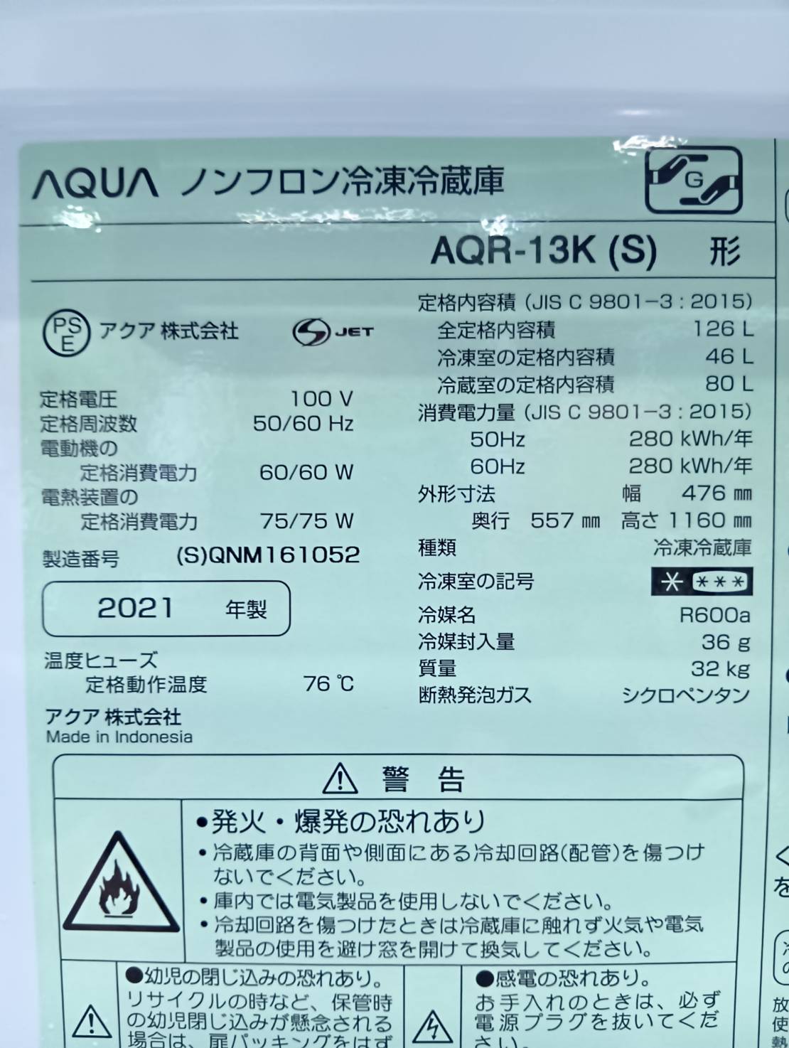 AQUA2021年製126L冷蔵庫 AQR-13K