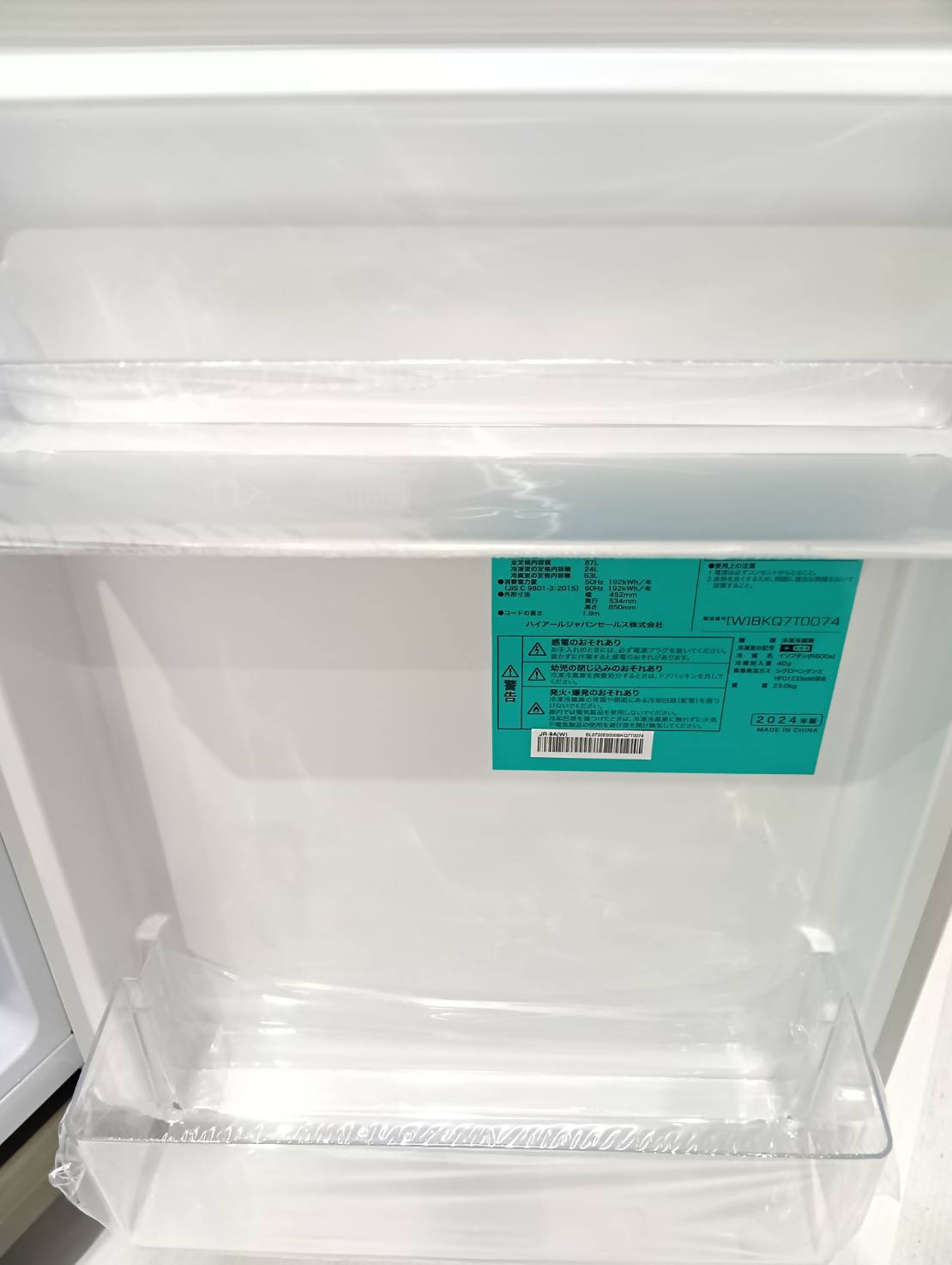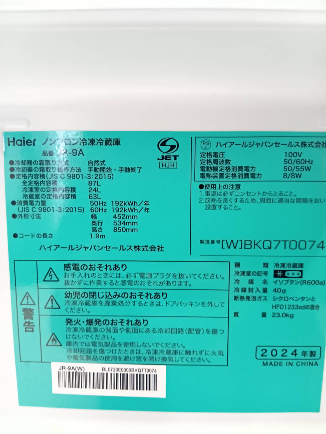 Haier2024年製87L冷蔵庫 型番 JR-9A 幅 奥行き 高さ 452*534*850㎜ 容量 冷凍室24L 冷蔵室63L 動作テスト 冷凍-20℃ 冷蔵2℃ 評価ランク A 【コンデションなど】 側面に擦り傷がありますが、内部はほとんど未使用の状態です。 【製品特徴】 ●2ドア直冷式冷蔵庫 87L ●耐熱 100℃トップテーブル ●地球にやさしいノンフロン 【保証期間】 商品到着から6カ月