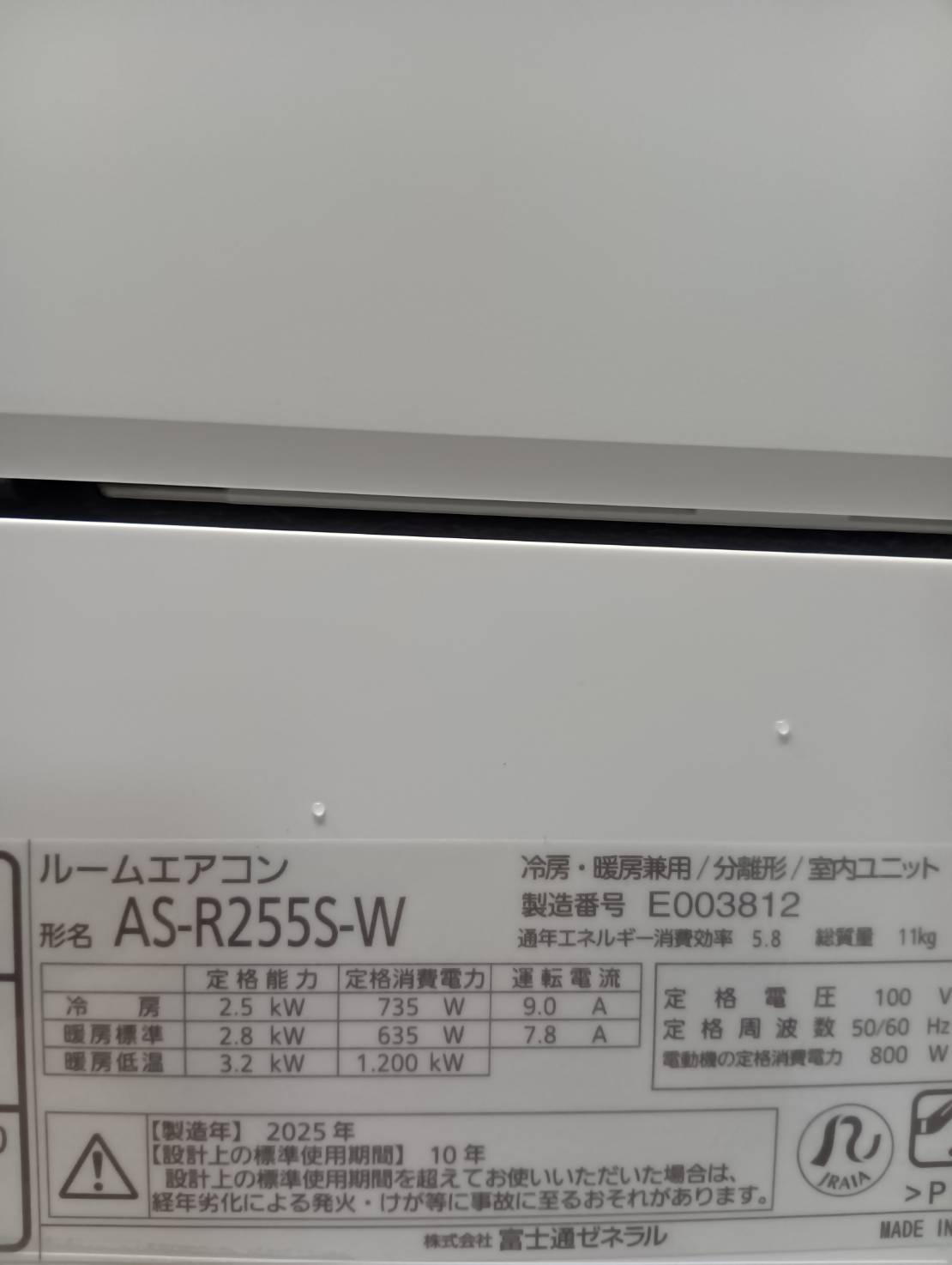 Fujitsu2025年製8畳エアコン AS-R255S-W