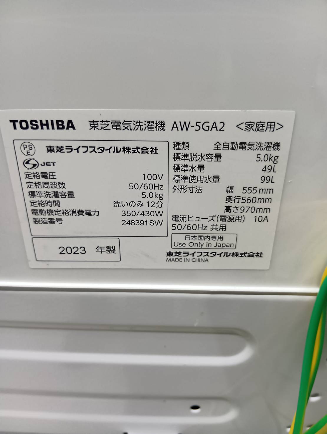TOSHIBA2023年製5.0Kg洗濯機