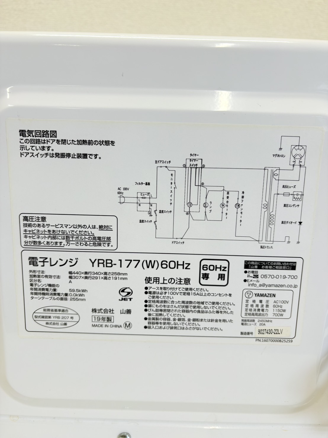 YAMAZEN2019年製電子レンジ 型番 YRB-177 本体サイズ 幅*奥行*高さ 440*340*258㎜ 庫内サイズ 幅*奥行*高さ 307*291*191㎜ 動作確認 OK 評価ランク B- 【コンディションなど】 庫内ダメージがございます。 【保証期間】 商品到着から2カ月