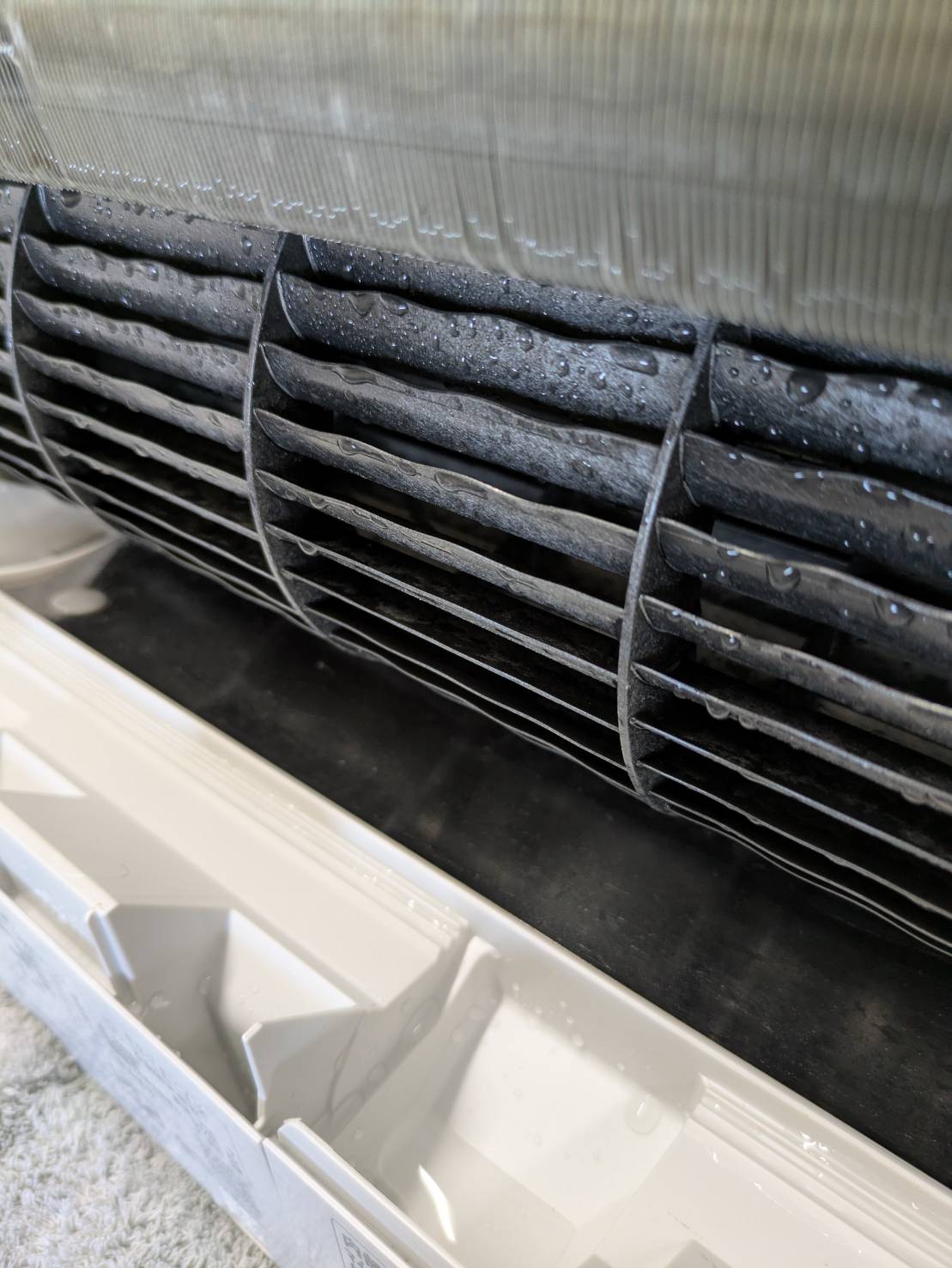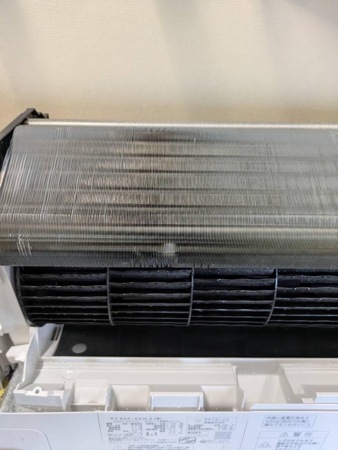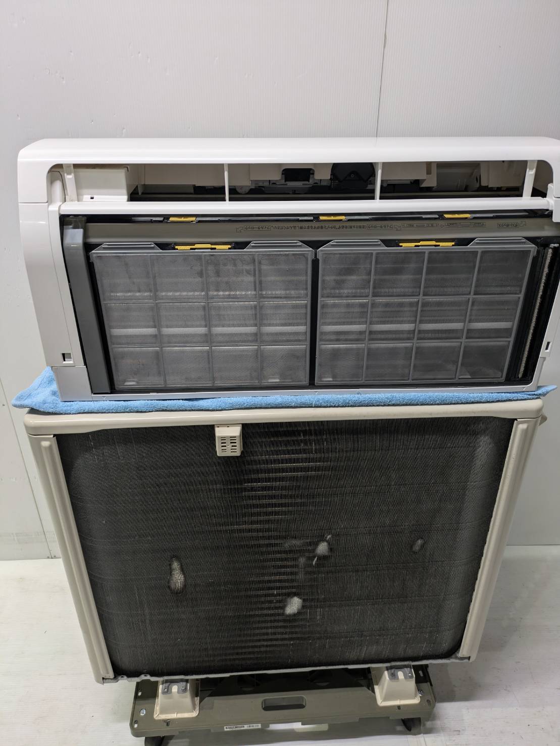 分解し、アルミフィン、シロッコファン、内部を高圧洗浄機で隅々まで洗浄しております。洗浄後に組み上げ動作確認まで行っております。