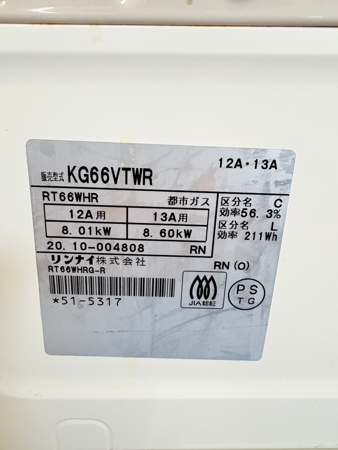 Rinnai2020年製【都市ガス】KG66VTWR
