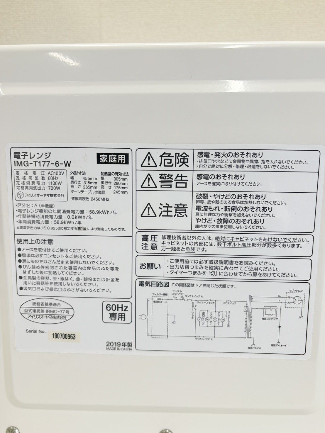アイリス2019年製電子レンジ 型番 IMG-T177-6-W 本体サイズ 幅*奥行*高さ 455*315*265㎜ 庫内サイズ 幅*奥行*高さ 305*280*175㎜ ターンテーブル 直径245㎜ 動作確認 OK 評価ランク B 【コンディションなど】 庫内ダメージがございます。 【保証期間】 商品到着から2カ月