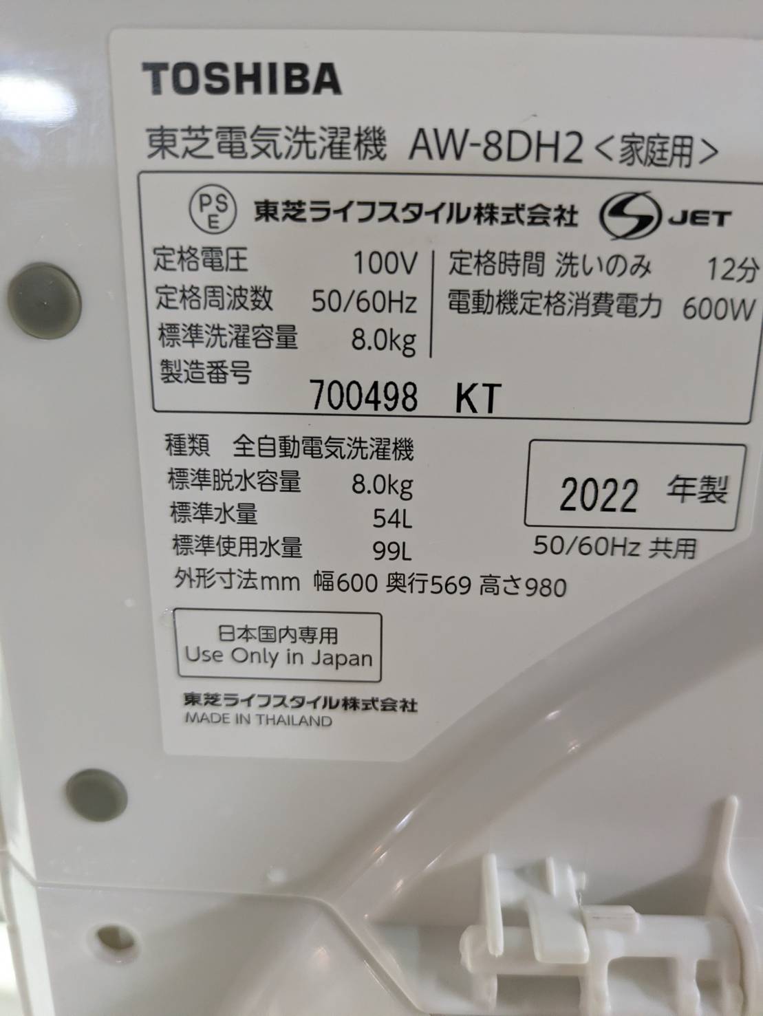 TOSHIBA2022年製8.0Kg洗濯機