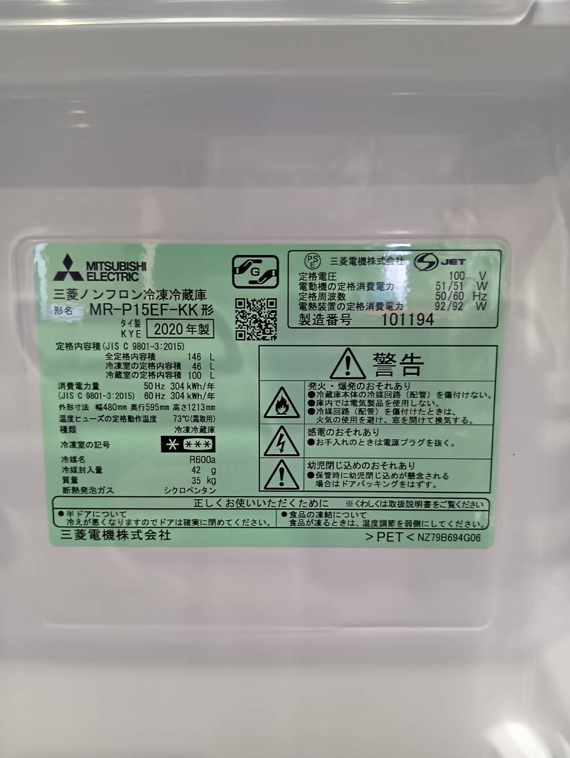 三菱電機2020年製146L冷蔵庫 MR-P15EF-KK
