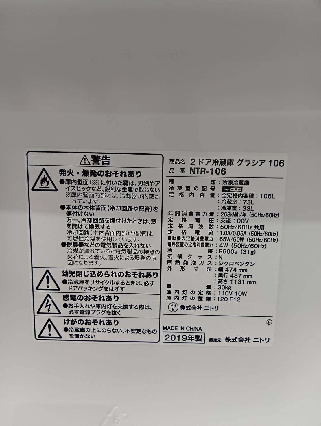 ニトリ2019年製106L冷蔵庫 NTR-106