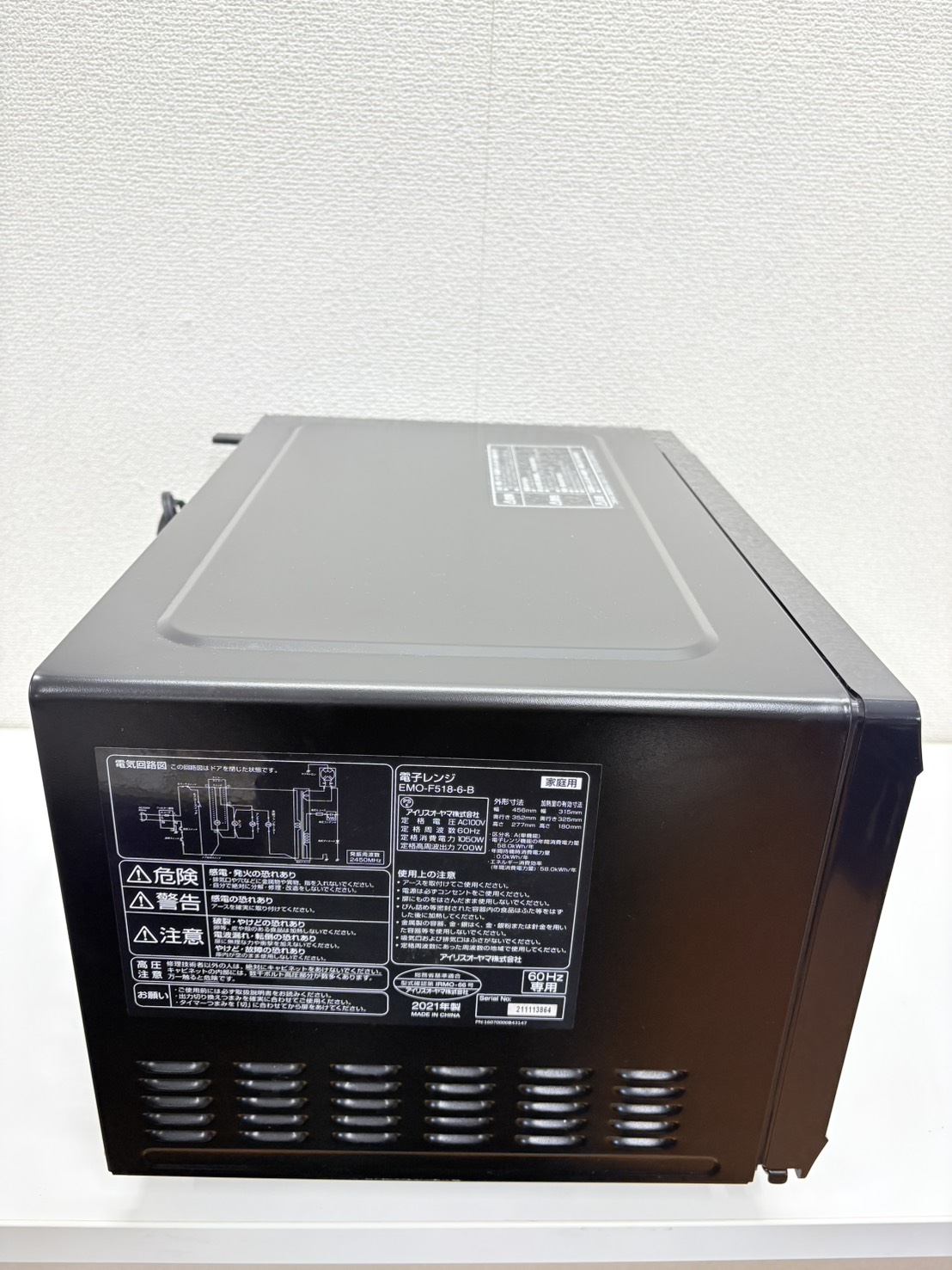 アイリス2021年製電子レンジ 型番 EMO-F518-6-B 本体サイズ 幅*奥行*高さ 456*352*277㎜ 庫内サイズ 幅*奥行*高さ 315*325*180㎜ 動作確認 OK 評価ランク B 【コンディションなど】 目立つダメージはありません。 【保証期間】 商品到着から2カ月