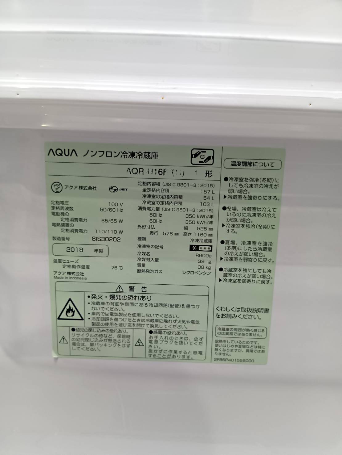 AQUA2018年製157L冷蔵庫 AQR-U16F(S)