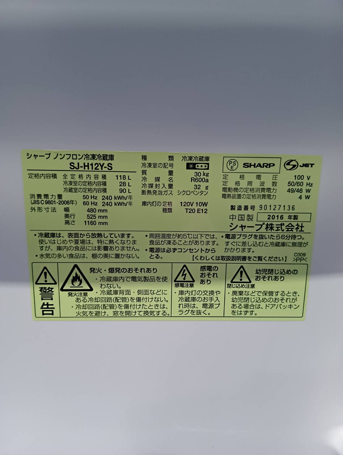 SHARP2016年製118L冷蔵庫 SJ-H12Y