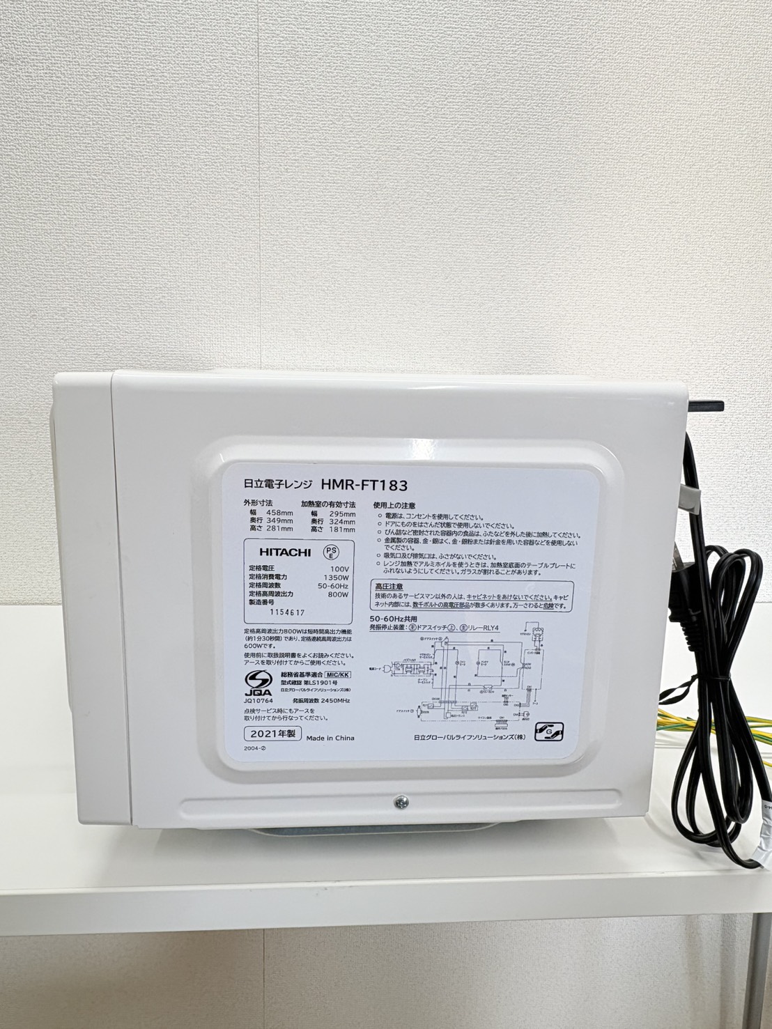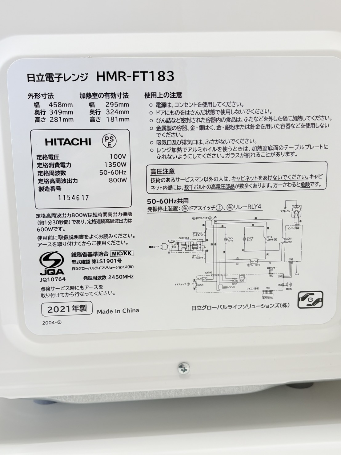 日立2021年製電子レンジ 型番 HMR-FT183 本体サイズ 幅*奥行*高さ 458*349*281㎜ 庫内サイズ 幅*奥行*高さ 295*324*181㎜ 動作確認 OK 評価ランク B 【コンディションなど】 目立つダメージはありません。 【保証期間】 商品到着から2カ月