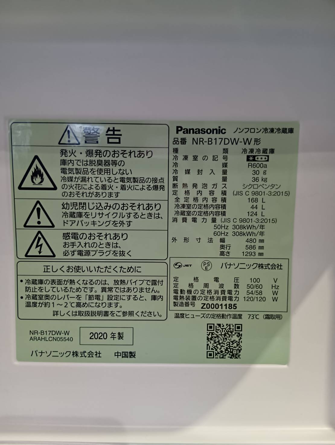 Panasonic2020年製168L冷蔵庫
