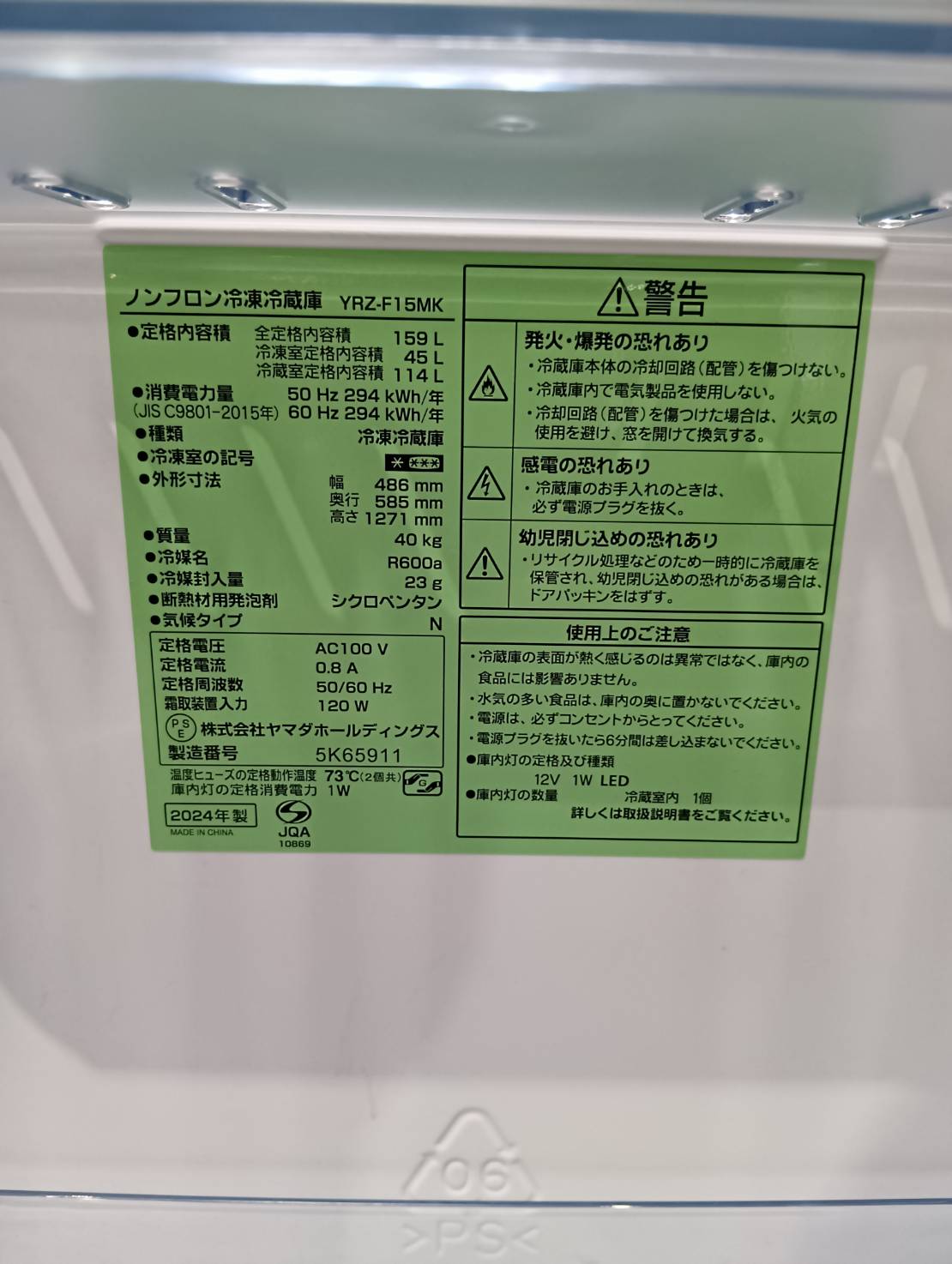 YAMADA2024年製159L冷蔵庫 YRZ-F15MK