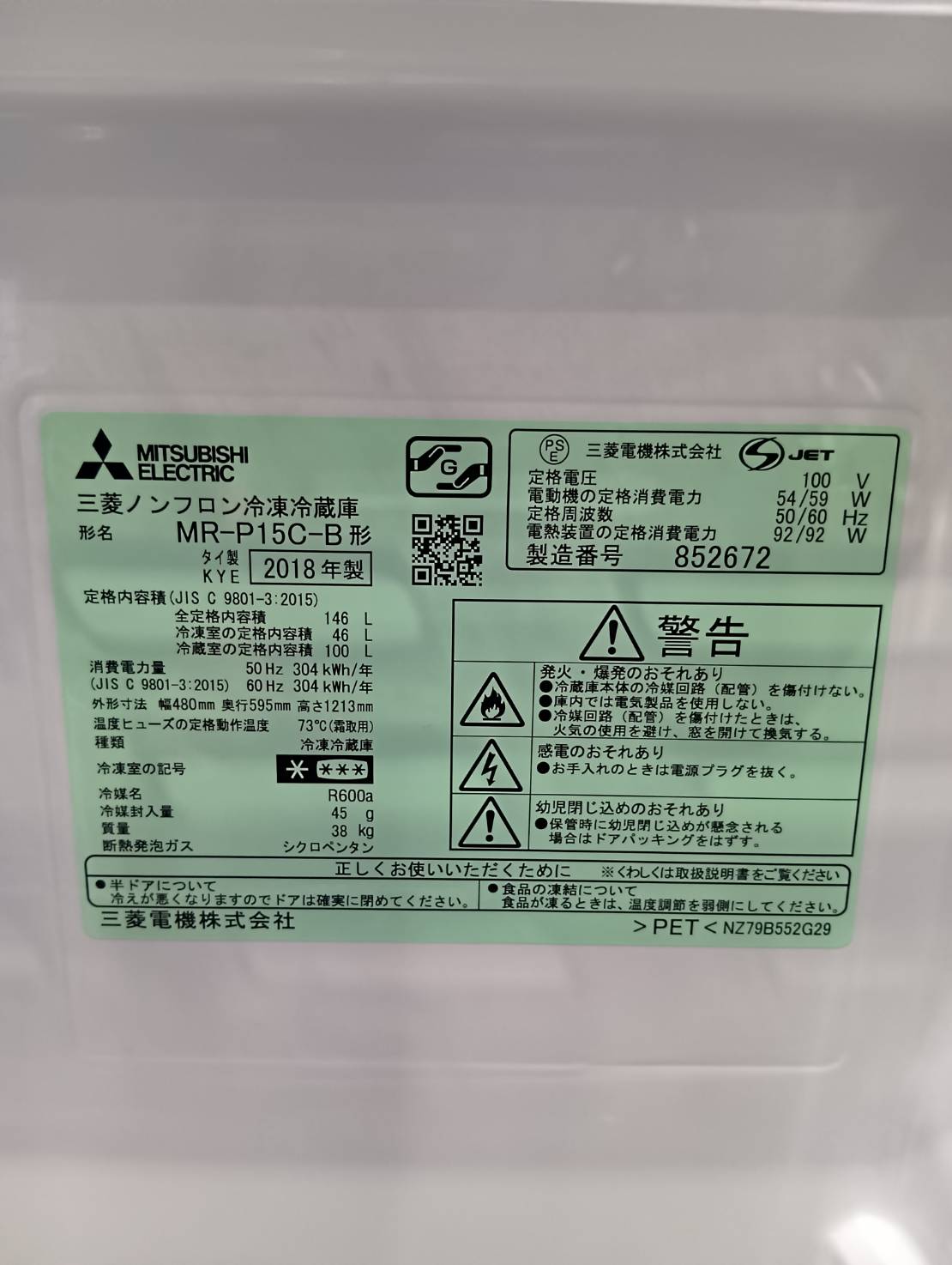 三菱電機2018年製146L冷蔵庫 MR-P15C-B