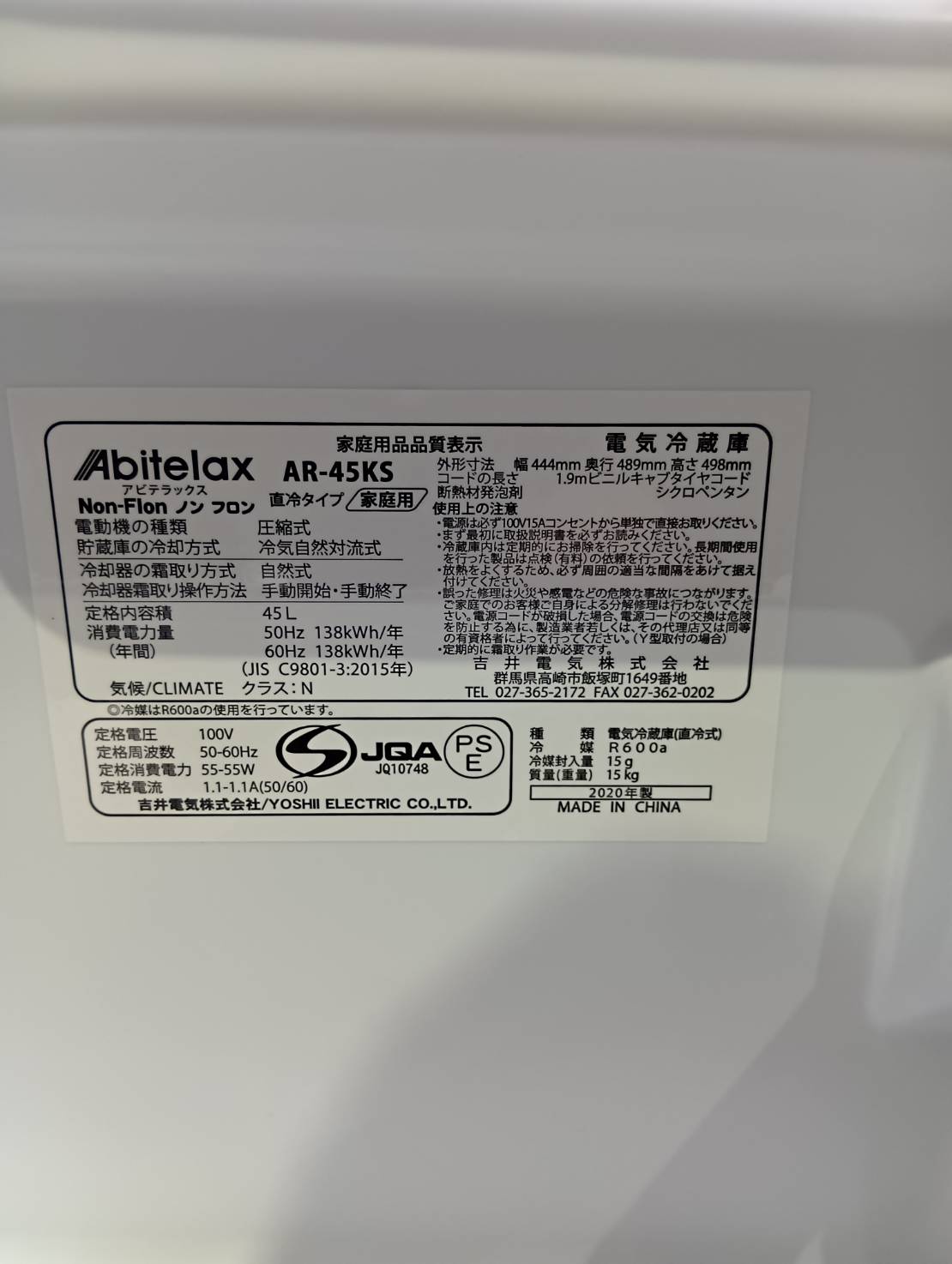 容量 45L(冷蔵のみ)