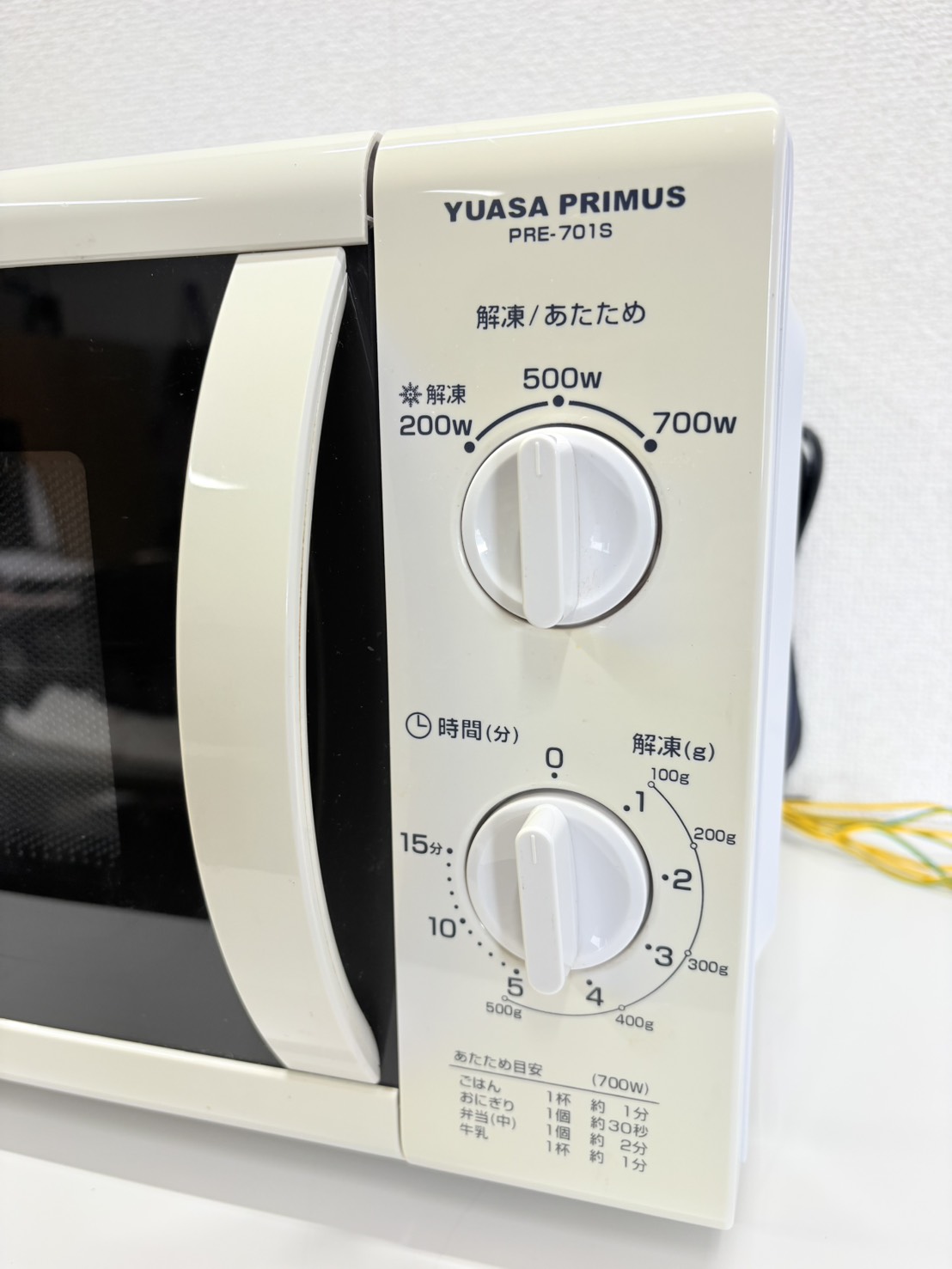 YUASA2018年製電子レンジ 型番 PRE-701S 本体サイズ 幅*奥行*高さ 440*259*258㎜ 庫内サイズ 幅*奥行*高さ 306*307*190㎜ ターンテーブル 直径255㎜ 動作確認 OK 評価ランク C 【コンディションなど】 庫内ダメージが多くございます。本体に日焼けがございます。 【保証期間】 商品到着から2カ月
