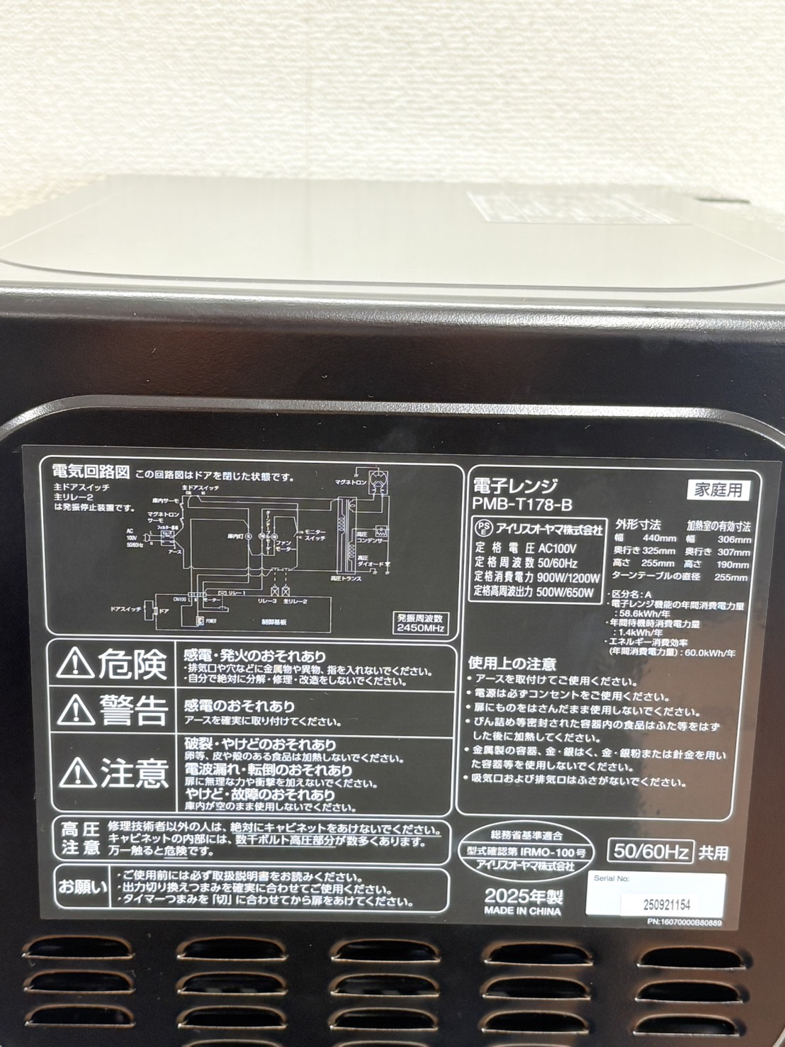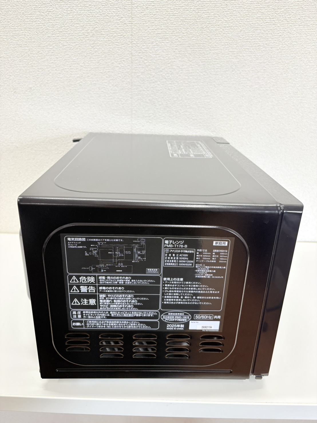 アイリス2025年製電子レンジ 型番 PMB-T178-B 本体サイズ 幅*奥行*高さ 440*325*255㎜ 庫内サイズ 幅*奥行*高さ 306*307*190㎜ ターンテーブル 直径255㎜ 動作確認 OK 評価ランク A 【コンディションなど】 目立つダメージのないきれいな商品です。 【保証期間】 商品到着から2カ月