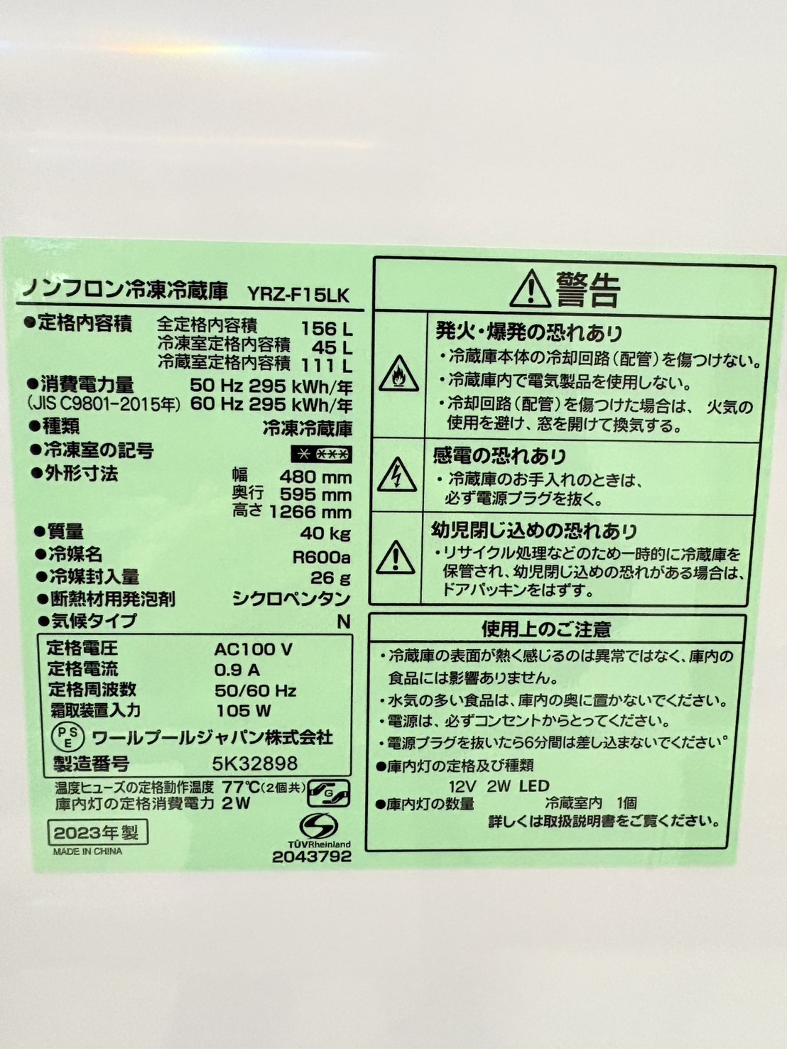 YAMADA2023年製156L冷蔵庫 YRZ-F15LK