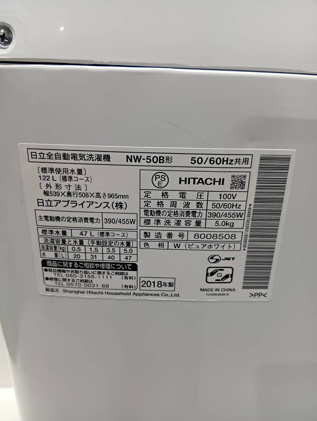 HITACHI2018年製5.0Kg洗濯機 NW-50B