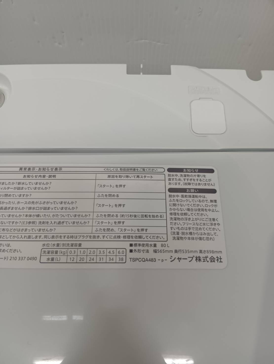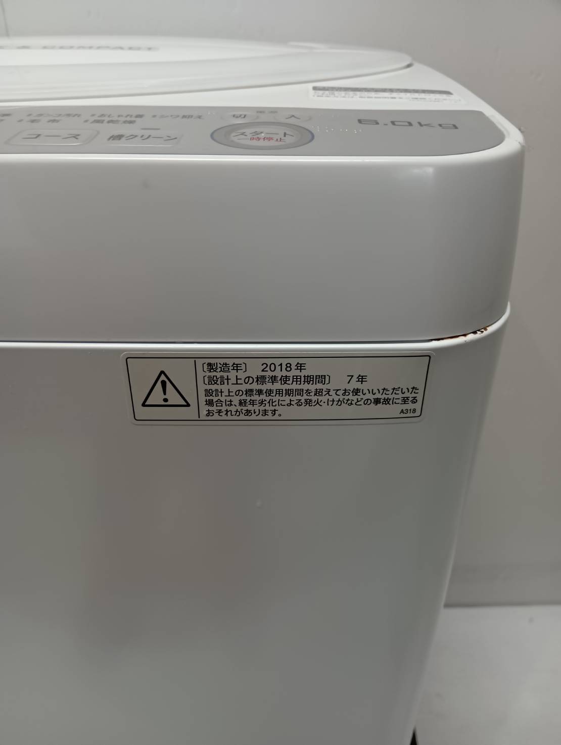 SHARP2018年製6.0Kg洗濯機 ES-GE6B-W