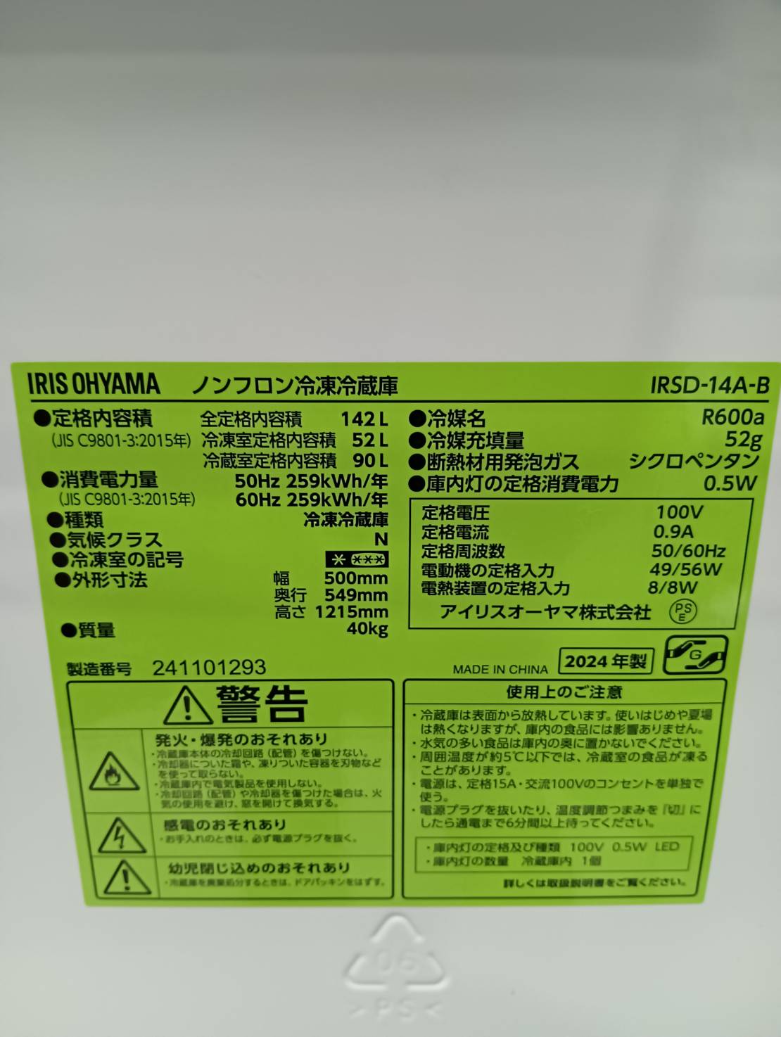 IRIS OHYAMA2024年製142L冷蔵庫